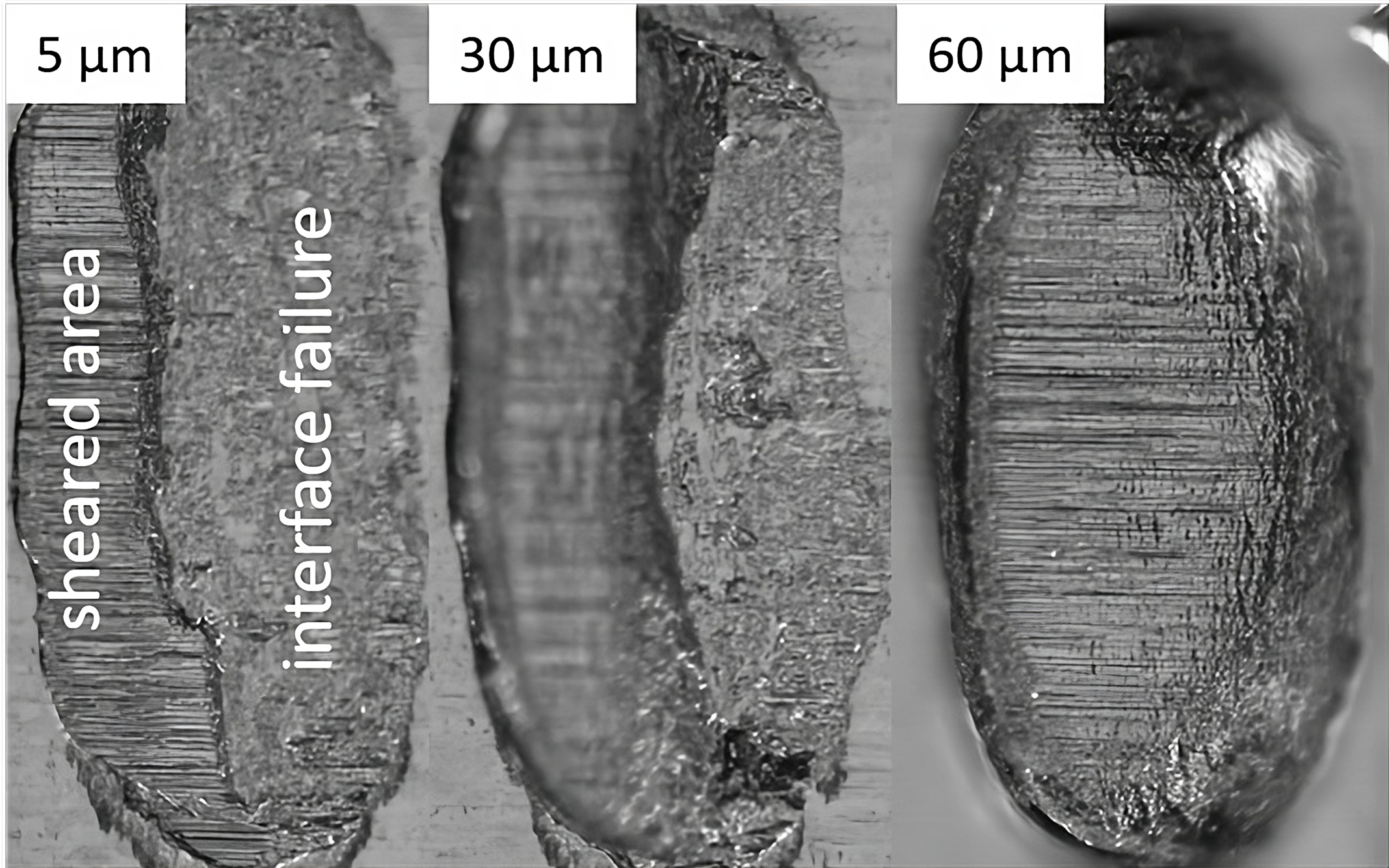 But these shear codes, originally defined for standard thick aluminum wires, do not translate well to more novel materials: The material tends to fail or lift off during shearing not in the wedge of extremely hard wire, but sometimes in the softer chip or substrate metallization layer. For standard quality checks, this would be recorded as an unacceptable early lift-off and taken to mean that the bond quality was insufficient. The old shear codes therefore allow no meaningful statement about the quality of the