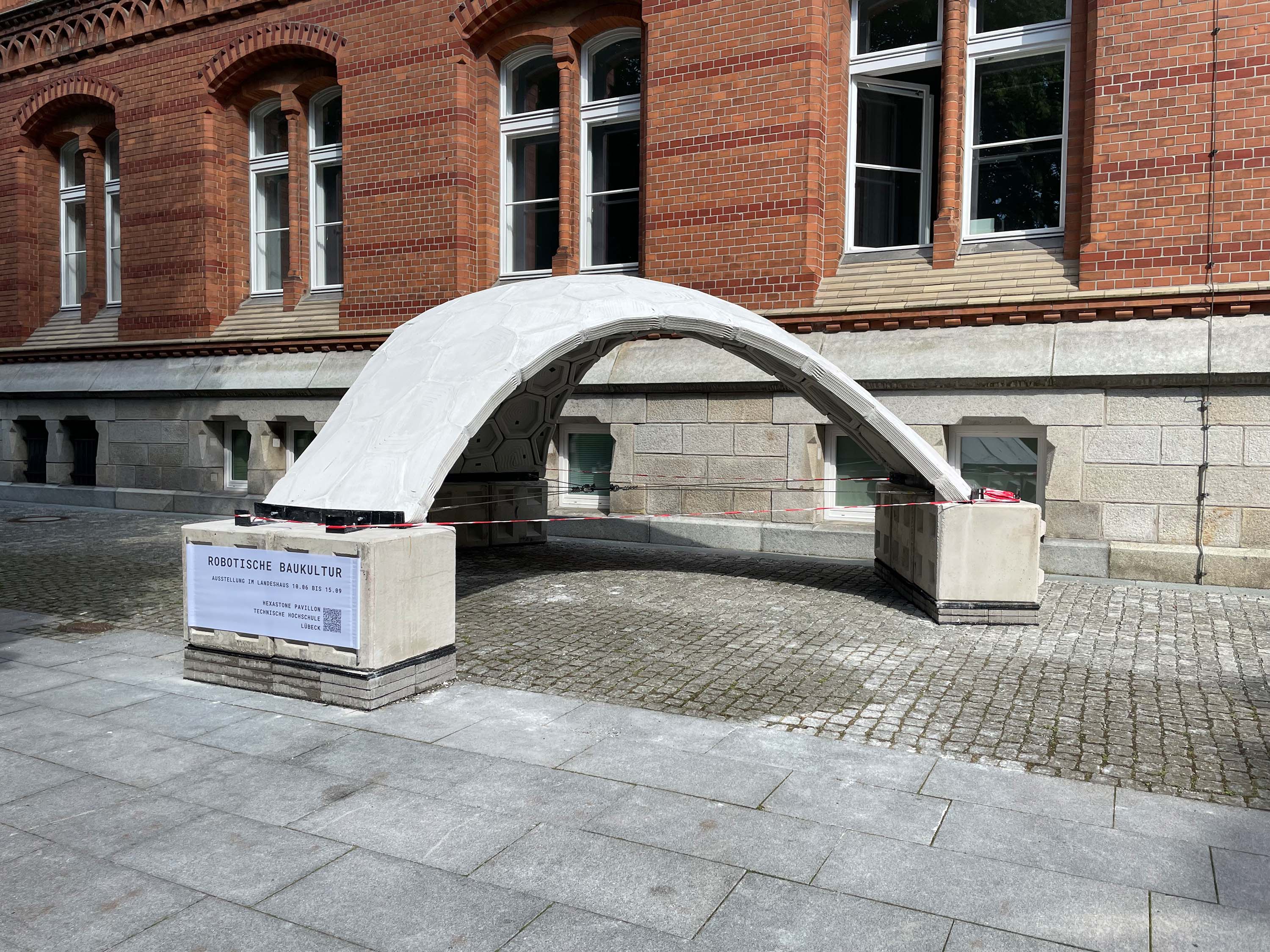 „Es geht uns darum, mit der Ausstellung zu zeigen, dass die Digitalisierung des Planens und Bauens eine große Chance darstellt“, sagt Michael Herrmann, Professor für Digitales Konstruieren an der TH Lübeck. „Durch eine geschlossene digitale Prozesskette können nicht nur Kosten und Zeit gespart werden, sondern es werden ästhetische und optimierte Strukturen baubar. Der 3D gedruckte Hexastone Betonpavillon ist dafür ein sehr gutes Beispiel. Es handelt sich dabei um eine Schalenstruktur, die als Dachstruktur von Veranstaltungshallen und Museen denkbar wäre. Sie schöpft Inspiration von historischen Gewölbestrukturen und spart durch ihre optimierte Form ca. 70% Material ein“, so Herrmann.