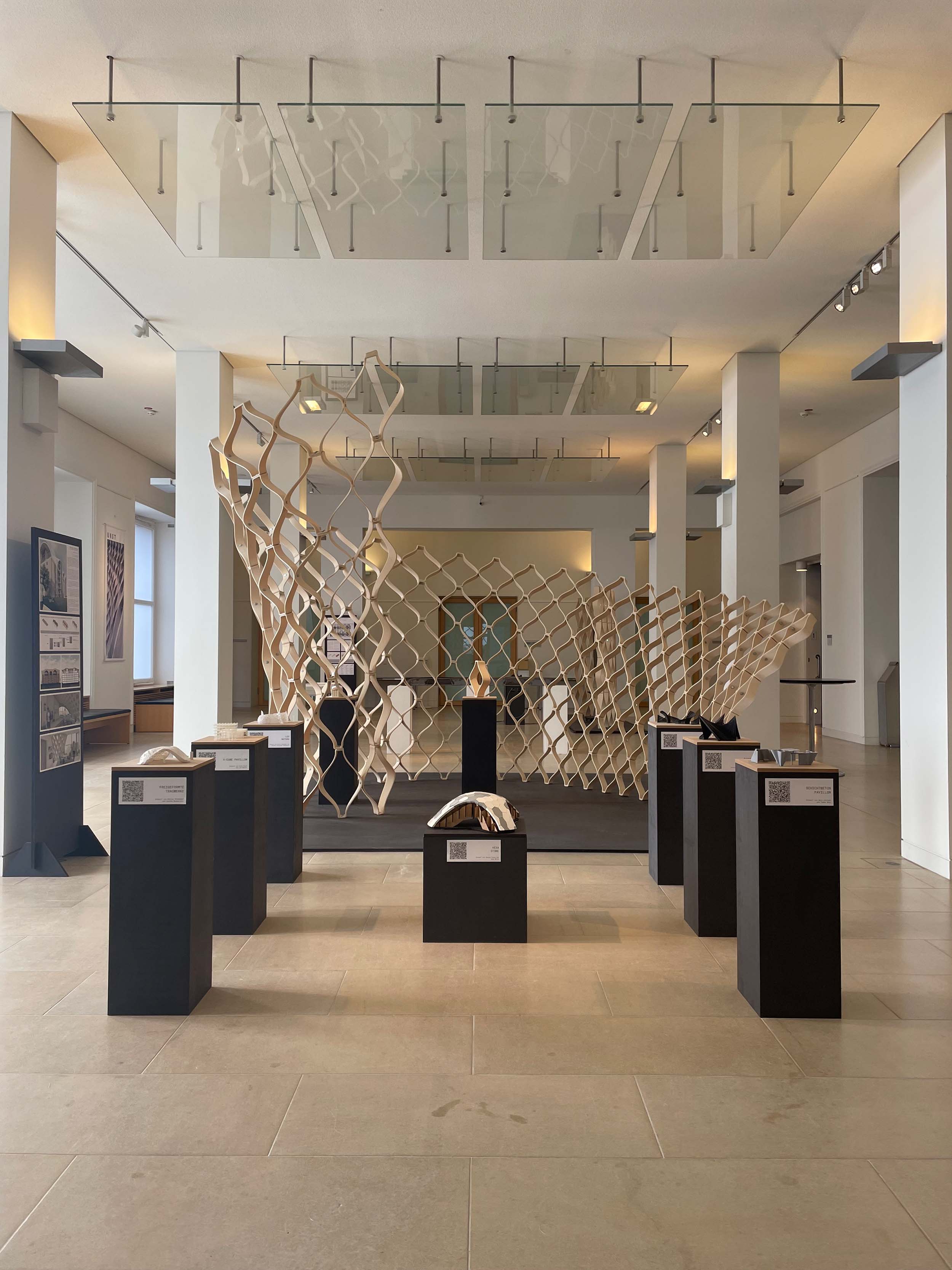 Ausgestellt sind zukunftsweisende Arbeiten an der Schnittstelle von Architektur und Ingenieurwesen. Im Mittelpunkt der Ausstellung stehen die „Forschungspavillons“ 2022 und 2023. Sie sind die Ergebnisse komplett digitaler Prozessketten, die vom architektonischen Entwurf über die Planung bis hin zur automatisierten Fertigung reichen.