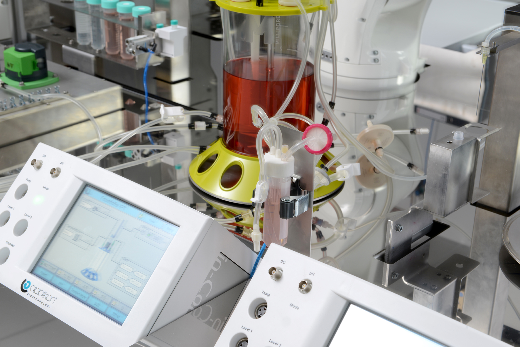 Eine der größten Herausforderungen bei stammzellbasierten Therapien ist die skalierbare Produktion der benötigten Zellmengen. Extrazelluläre Vesikel (EV) werden aufgrund ihrer etablierten Behandlungserfolge als Therapeutika für degenerative und tumorbedingte Erkrankungen eingesetzt. EV sind empfindliche membrangebundene Partikel, die sich aus ihren Ursprungszellen gelöst haben. Diese Art der Vesikel müssen für die Herstellung der Therapeutika aus spezialisierten Stammzellen hergestellt und aus dem Zellkulturmedium gewonnen werden. Die Herausforderung der effizienten Produktion in großen Mengen liegt in der Fragilität der EV. Deshalb ist heute die Expansion der Zellen in Bioreaktoren nur in kleinen Volumina und mit speziellen Geräten möglich. Das treibt jedoch die Herstellungskosten in die Höhe. Die Partner im Projekt »RauPE« entwickeln dafür nun eine robuste und automatisierte Expansionsplattform, die auf dem Membranrührer-Bioreaktor des Aachener Spin-offs BioThrust basiert. Mit dieser Expansionsplattform sollen zukünftig qualitativ hochwertige EV automatisiert produziert werden können.