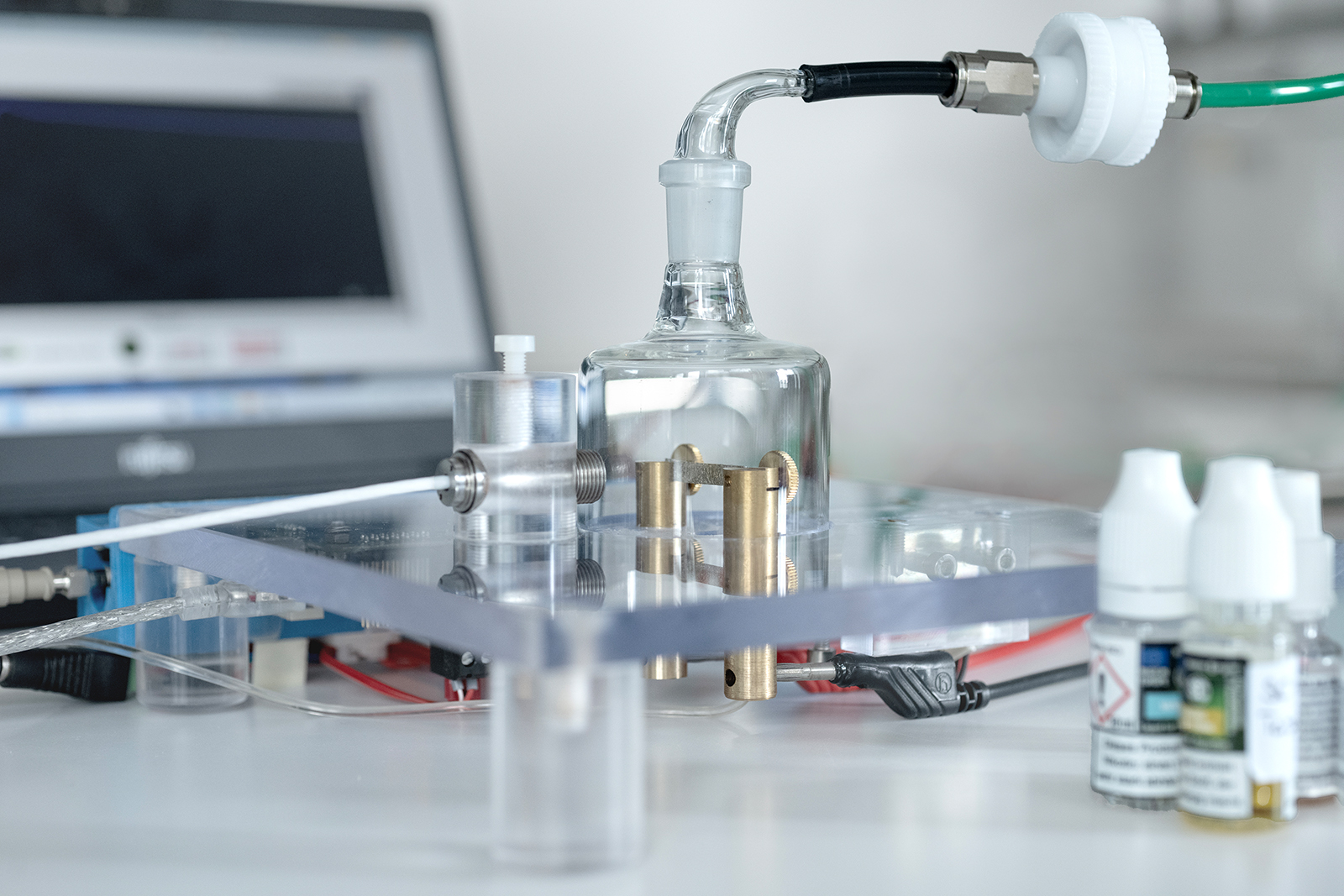 Die Testung verschiedener kommerziell erhältlicher E-Liquids bei variierenden Temperaturen findet unter reellen Bedingungen statt: Das E-Liquid wird schlagartig verdampft, wobei es normaler Umgebungsluft ausgesetzt ist. Eine kontinuierliche Echtzeitmessung der Temperatur stellt sicher, dass eine Überhitzung während des Testens vermieden wird. »Wir tragen kleine Mengen des Liquids auf eine heiße Heizoberfläche auf, wobei es sofort verdampft wird. Den Dampf saugen wir ab, überführen ihn in die Analysegeräte und prüfen, welche Substanzen sich im Dampf befinden. Diese können mit den analysierten Stoffen vor dem Verdampfen verglichen werden, um eine Aussage über deren Thermostabilität zu erhalten«, beschreibt Dr. Scheffler die Testung. Erste Ergebnisse belegen, dass das Spektrum der gefundenen Stoffe temperaturabhängig ist.