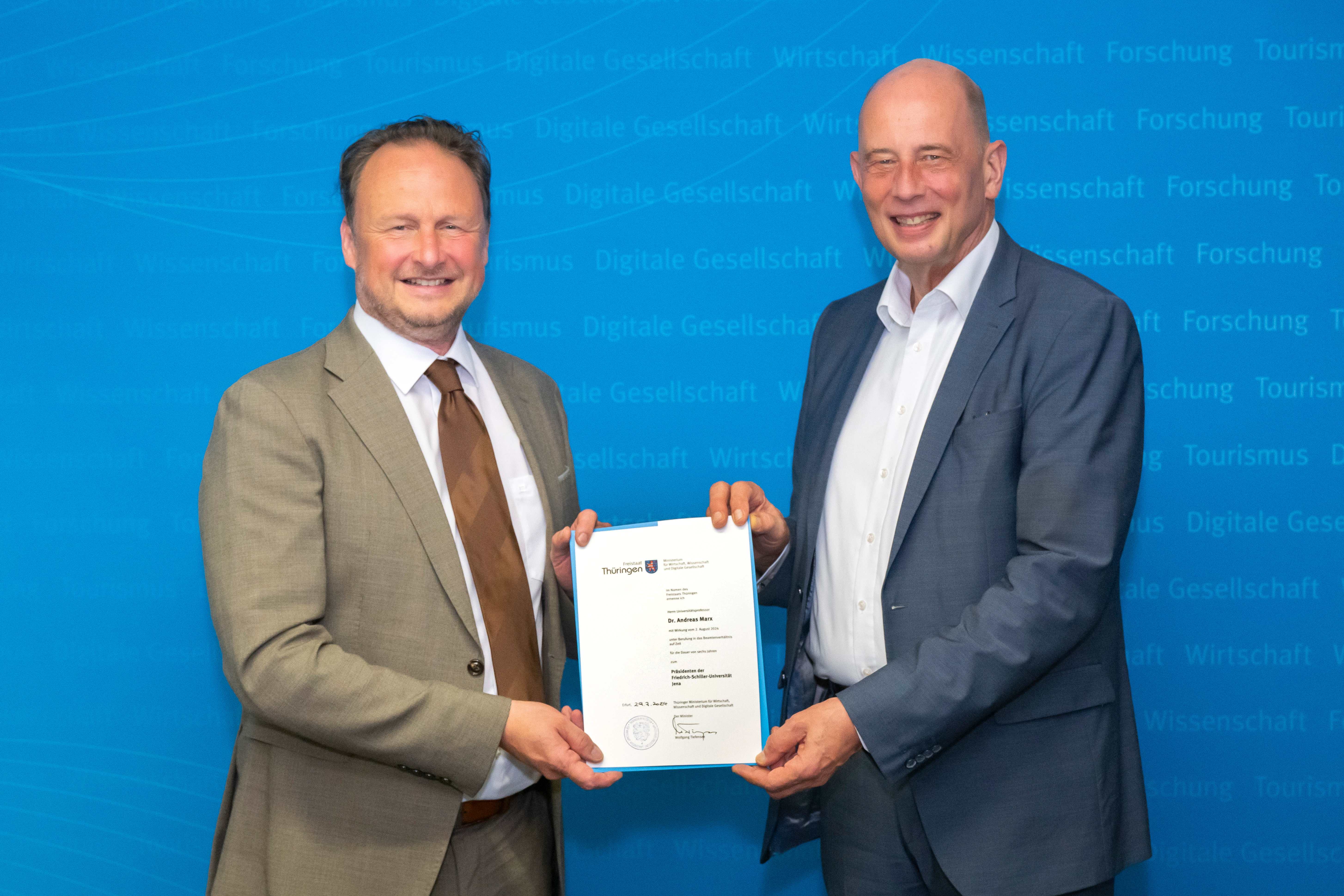 Wissenschaftsminister Wolfgang Tiefensee hat heute Prof. Dr. Andreas Marx zum Präsidenten der Friedrich-Schiller-Universität Jena ernannt und ihm die Ernennungsurkunde unter Berufung in das Beamtenverhältnis auf Zeit übergeben. Die Amtszeit des Präsidenten dauert sechs Jahre und endet am 1. August 2030. Die Wahl durch die Hochschulversammlung der Universität Jena erfolgte am 9. April.