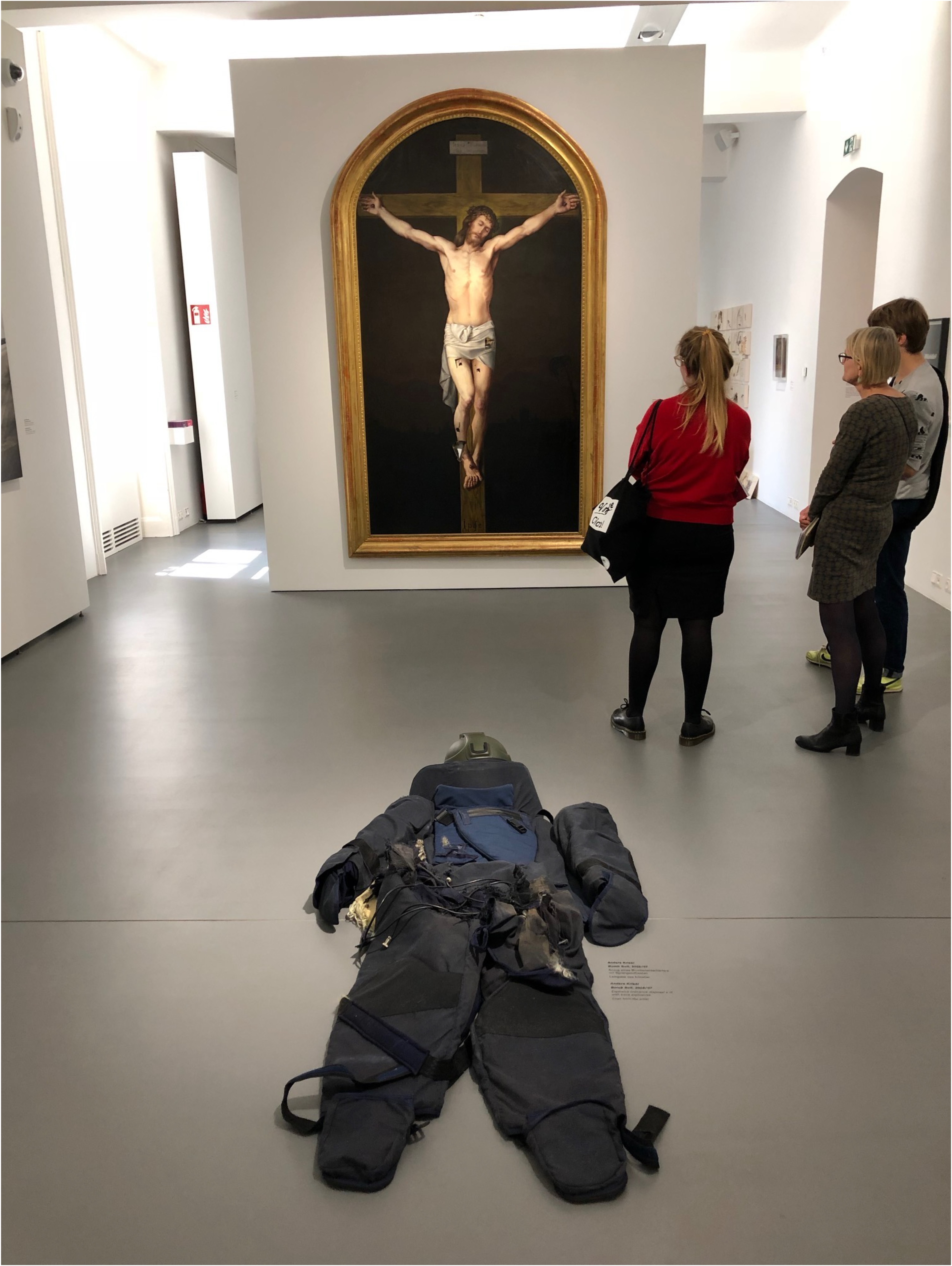 Mitglieder des Kuratoriums des Dom Museum Wien und Forscher*innen der Universität Wien, Fakultät für Psychologie, begutachten Kunstwerke aus der Ausstellung "Zeig mir deine Wunde" (J. Schwanberg und K. Speidel, Kuratoren; Dom Museum Wien). C: M. Pelowski (Bildnachweis: oben, unbekannter Künstler, Kreuzigungsszene aus dem Bischofspalast, frühes 19. Jahrhundert, mit Stichverletzungen durch die Nazi-Besatzung, gemeinfrei; unten, Anders Krisár, Bomb Suit, 2006/7, Bild mit Erlaubnis des Künstlers verwendet)