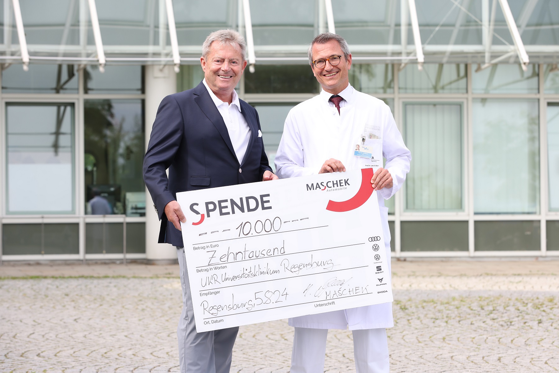 Mehr als 340.000 Menschen sind laut Statistischem Bundesamt im Jahr 2021 an Herz-Kreislauf-Erkrankungen verstorben. Allein die Koronare Herzkrankheit (KHK), eine Verkalkung der Herzarterien, ist für etwa 75.000 Todesfälle ursächlich. Dass Ingo Maschek nicht dazu gehört, hat er Professor Dr. Lars Maier, Direktor der Klinik und Poliklinik für Innere Medizin II des UKR, und Professor Dr. Christof Schmid, Direktor der Klinik und Poliklinik für Herz-, Thorax- und herznahe Gefäßchirurgie des UKR, zu verdanken. „Ich bin dankbar, noch am Leben zu sein. Professor Maier und Professor Schmid haben mir das Leben gerettet. Ich hatte einen Herzinfarkt erlitten, und es stand Spitz auf Knopf“, erklärt Ingo Maschek, Inhaber der Maschek Automobile GmbH. Aus Dankbarkeit für sein „neues“ Leben spendet Maschek nun 10.000 Euro an das Universitäre Herzzentrum Regensburg. „Ich möchte nicht nur `Danke` sagen, sondern gerne die Arbeit am UHR unterstützen, damit sich die Medizin weiterentwickeln und in Zukunft möglichst allen Patienten in einer solchen Situation geholfen werden kann“, fasst der Unternehmer aus der nördlichen Oberpfalz zusammen.