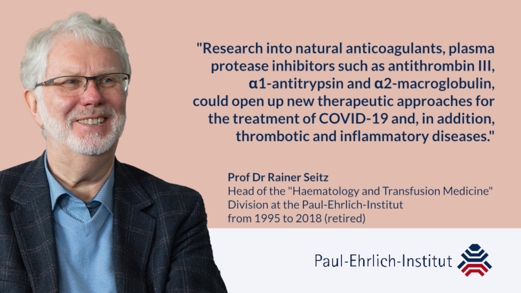 Professor Rainer Seitz was a clinician at the University Hospital of Marburg and head of the Haematology and Transfusion Medicine Division at the Paul-Ehrlich-Institut. He investigated this topic with two fellow retired colleagues: Professor Lutz Gürtler, former virologist at the Ludwig-Maximilians-Universität München (LMU) and Professor Wolfgang Schramm, former haematologist at LMU. They evaluated the available data on the three natural protease inhibitors antithrombin III (ATIII), α1-antitrypsin (α1-AT) and α2-macroglobulin (α2-M). Protease inhibitors inhibit the activity of protein-degrading enzymes.