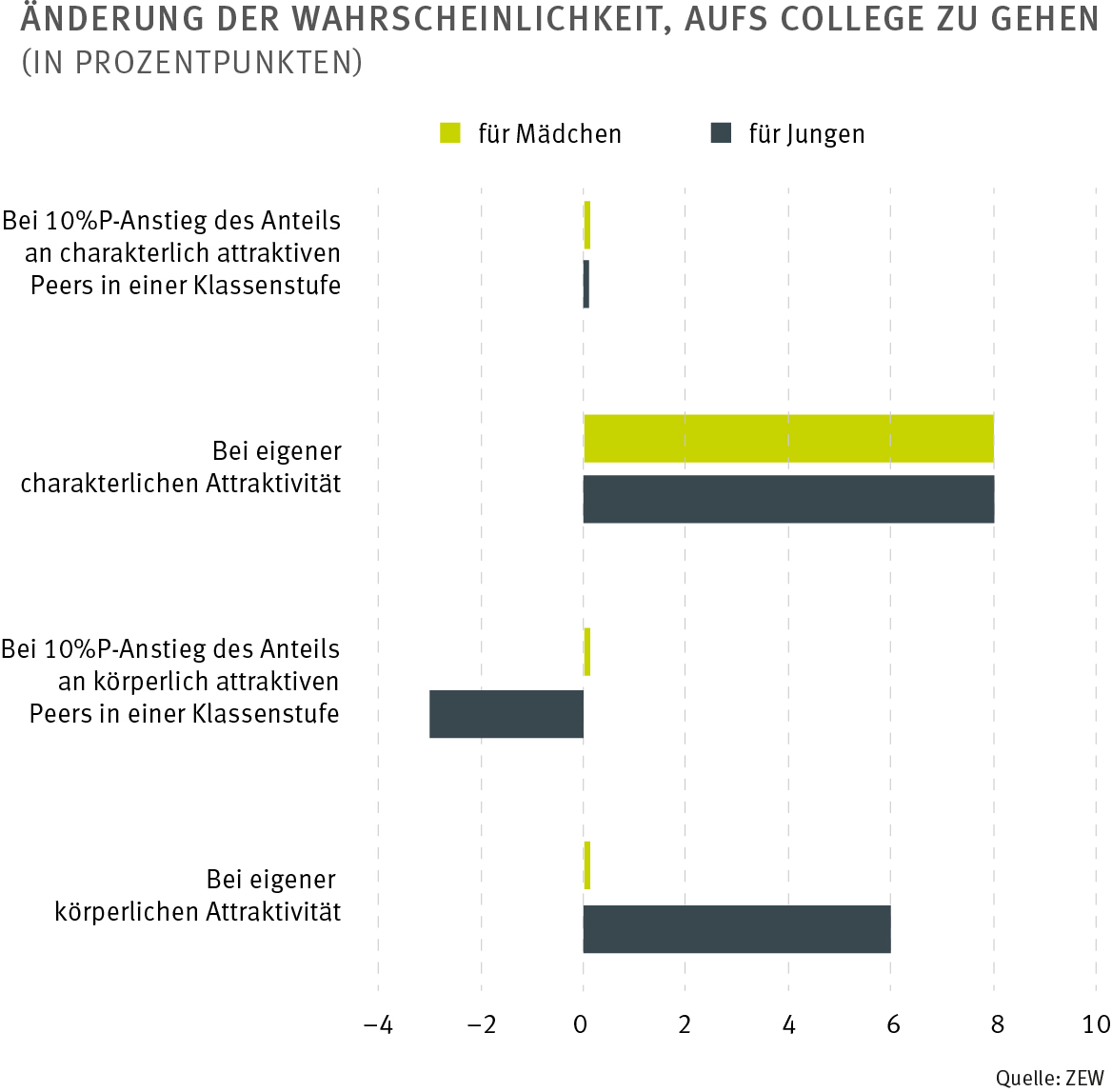 Dem zugrunde liegt ein geschwächtes Selbstbewusstsein, wie sich aus Selbsteinschätzungen der Schüler ergibt. Da der Anteil der körperlich attraktiven Peers in einer Klassenstufe zufällig ist, kann der Zusammenhang zwischen Noten und körperlich attraktiver Peergroup als kausal interpretiert werden.