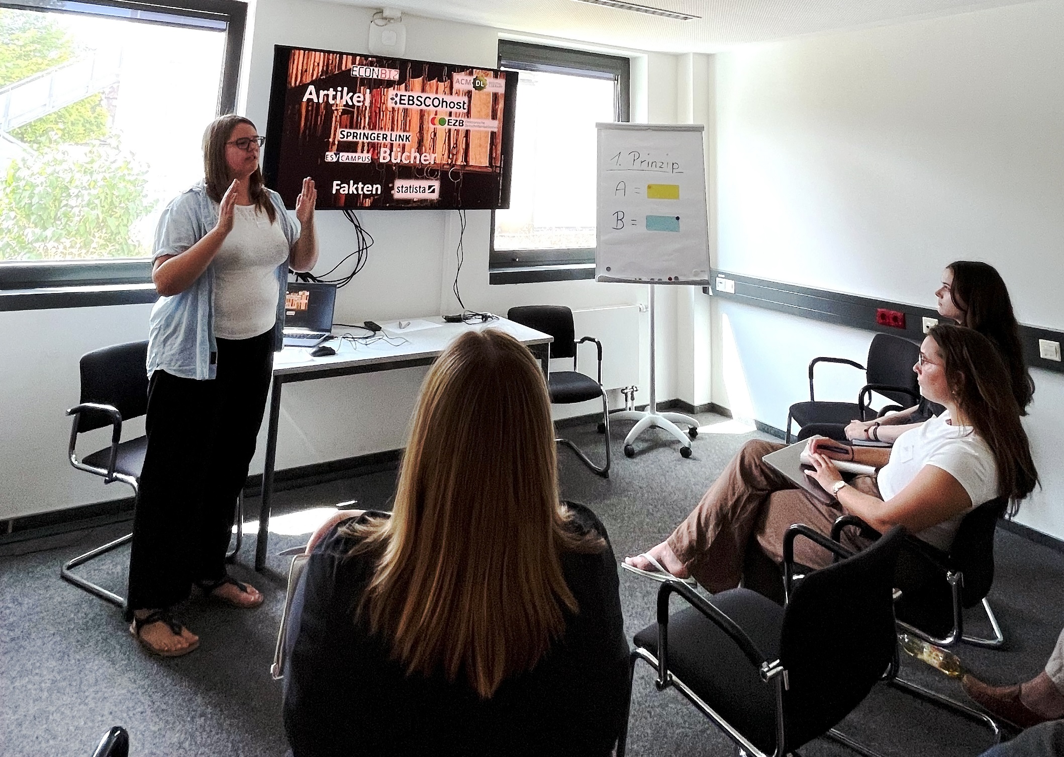 Welche Herausforderungen eine Seminar- oder gar eine Abschlussarbeit mit sich bringt, zeigt sich oft erst, wenn man schon mittendrin steckt. Von der ersten Recherche über den gesamten Schreibprozess bis hin zur finalen Formatierung ist ein hohes Maß an Selbstorganisation gefragt. An der Hochschule Worms wird man damit aber nicht allein gelassen. Auch in der vorlesungsfreien Zeit werden die Studierenden von der Teaching Library, der SchreibWerkstatt und der Zentralen Studienberatung unterstützt. Bei der SchreibOlympiade am 24. Juli standen alle drei Bereiche den Studierenden, die im Sommer eine wissenschaftliche Arbeit schreiben, mit ihren vielfältigen Angeboten zur Seite. Wie jedes Jahr stellte die Bibliothek ihre Räumlichkeiten für das SchreibEvent zur Verfügung.