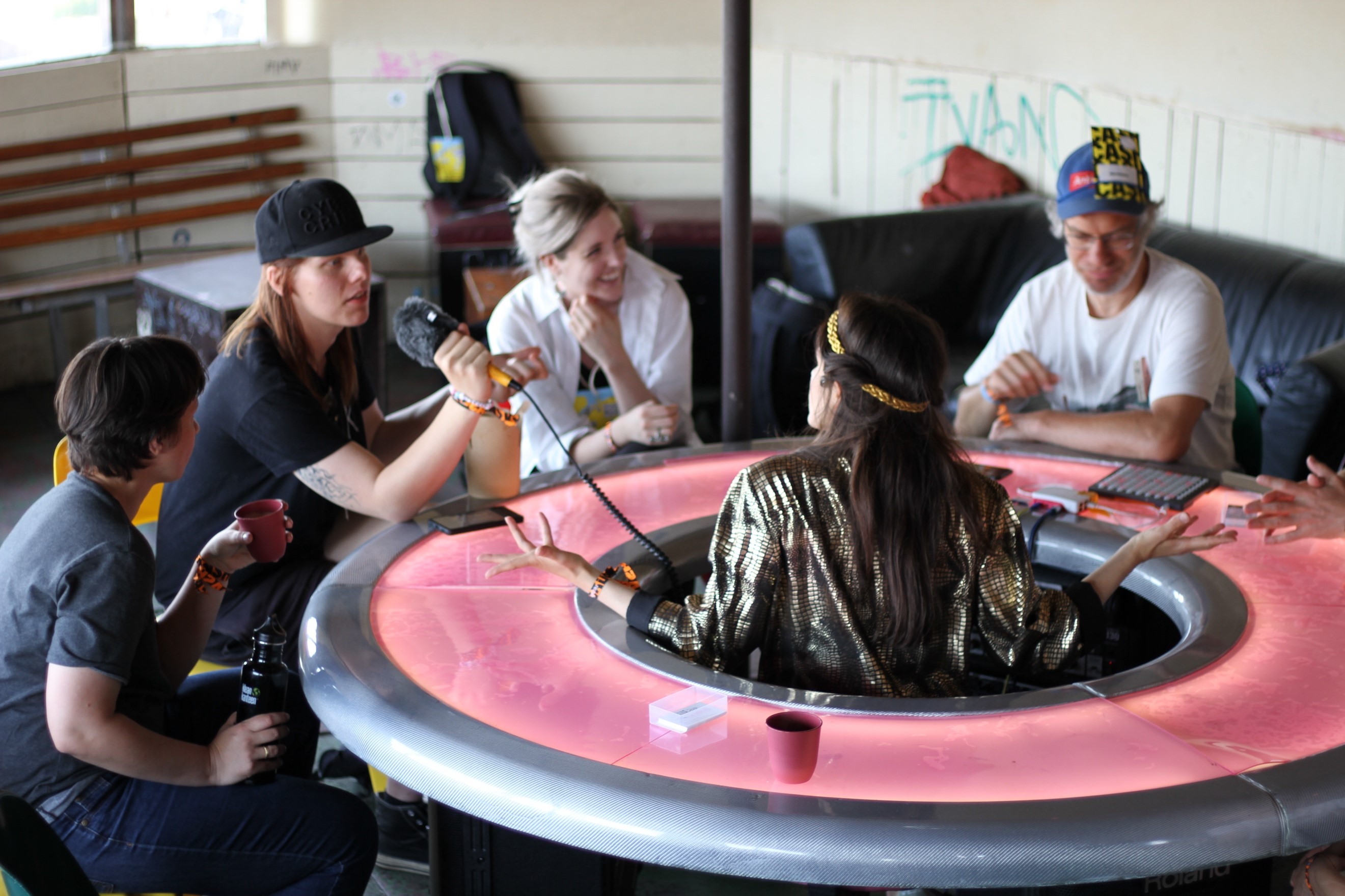 Entwickelt wurde „Talkaoke“ (aus „Talkshow“ und „Karaoke“) von „The People Speak“, einem Künstler*innen-Kollektiv aus London. Es sorgt für rege Diskussionen zwischen Teilnehmer*innen und Moderator*innen. An einem donutförmigen Tisch bestimmen die außen sitzenden Teilnehmer*innen selbst das Thema und führen miteinander ein Gespräch, das von Mitarbeiter*innen des SFB moderiert wird. „Mit diesem Format erreichen wir auch Bürger*innen, die nicht aktiv den Kontakt zur Wissenschaft und Universität suchen“, erklärt Dr. Birte Schaller vom Team des Projekts „Ö“, die dieses Format bereits als „Plauderlabor“ 2019 beim „Uni.Stadt.Fest“ zum Jubiläum der Universität Bielefeld erprobt hat.