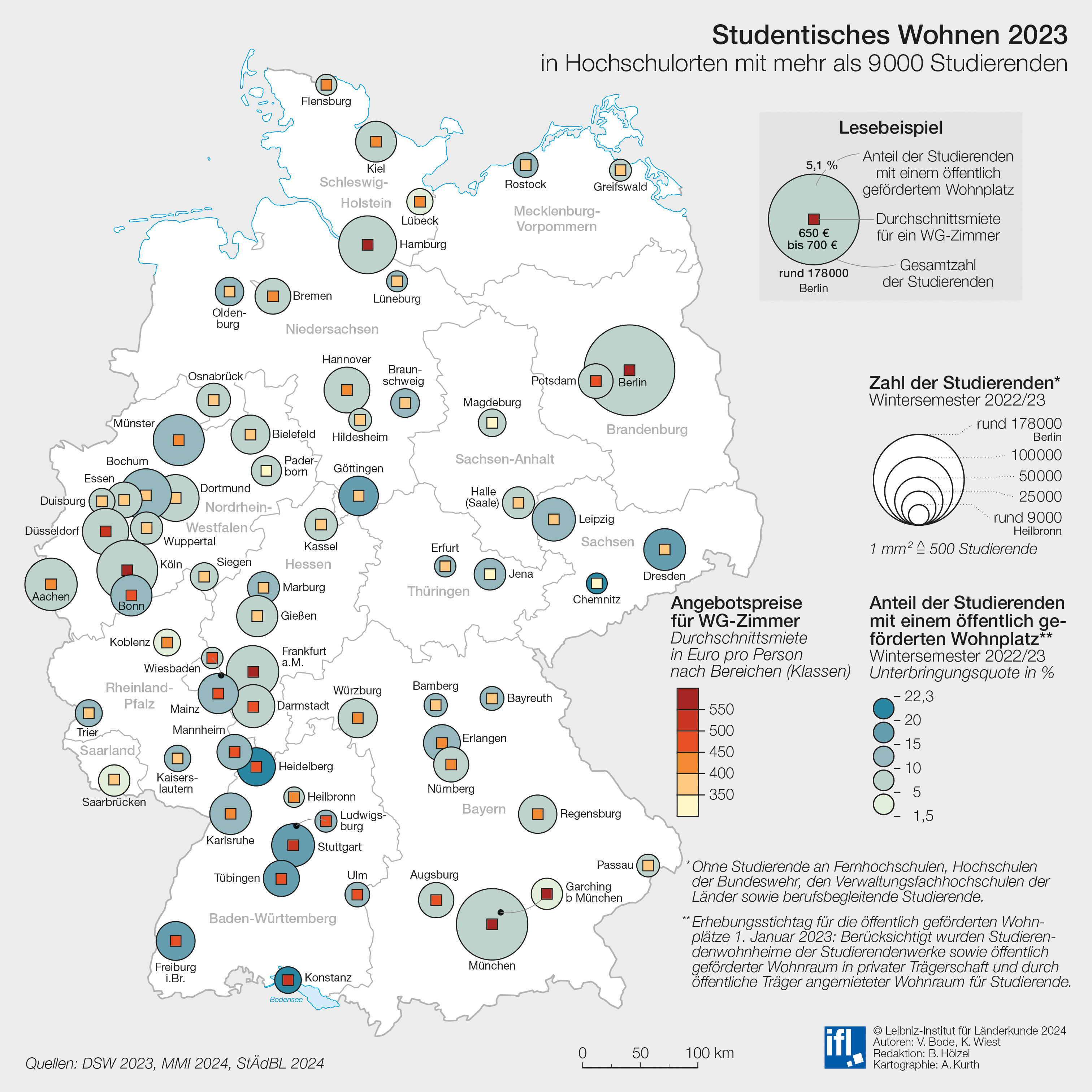 Die Wohnsituation deutscher Studierender unterscheidet sich teils stark. Ist ein WG-Zimmer in Chemnitz, Jena oder Dresden noch vergleichsweise günstig zu bekommen, liegen die Mieten in Berlin, Hamburg oder Köln meist weit über der BAföG-Wohnkostenpauschale von 360 Euro. Am teuersten ist München mit einer Durchschnittsmiete von 760 Euro einschließlich Betriebskosten für ein WG-Zimmer. Dies und mehr zeigen interaktive Deutschlandkarten des Leibniz-Instituts für Länderkunde (IfL), die unter aktuell.nationalatlas.de frei abrufbar sind. Im Begleittext erläutern Karin Wiest und Volker Bode die Ursachen und möglichen wirtschaftlichen und demografischen Folgen der Diskrepanzen zwischen den Hochschulstädten.