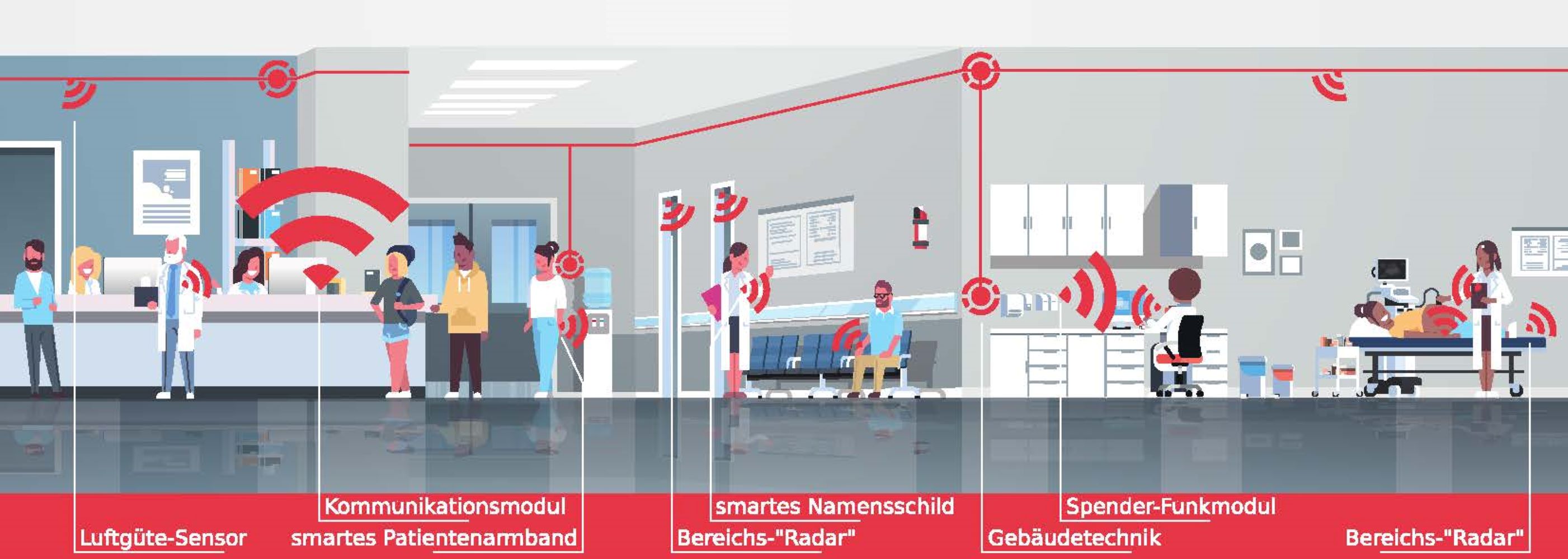 Bildunterschrift: DiSH-O-Klin – smarte Hygiene, Komponenten- und Situationsübersicht. Der Lösungsansatz des „Anreiz- und Dokumentationssystems zur Optimierung der Hygienesituation im Klinikbetrieb“ besteht aus einer ubiquitär verteilten, drahtlos vernetzten Installation digitaler Sensor- und Interaktionskomponenten, die auf stationärer Seite durch KI-Auswertung, Lagebilderzeugung und Visualisierung ergänzt wird (Copyright: Logic Way GmbH, Schwerin).