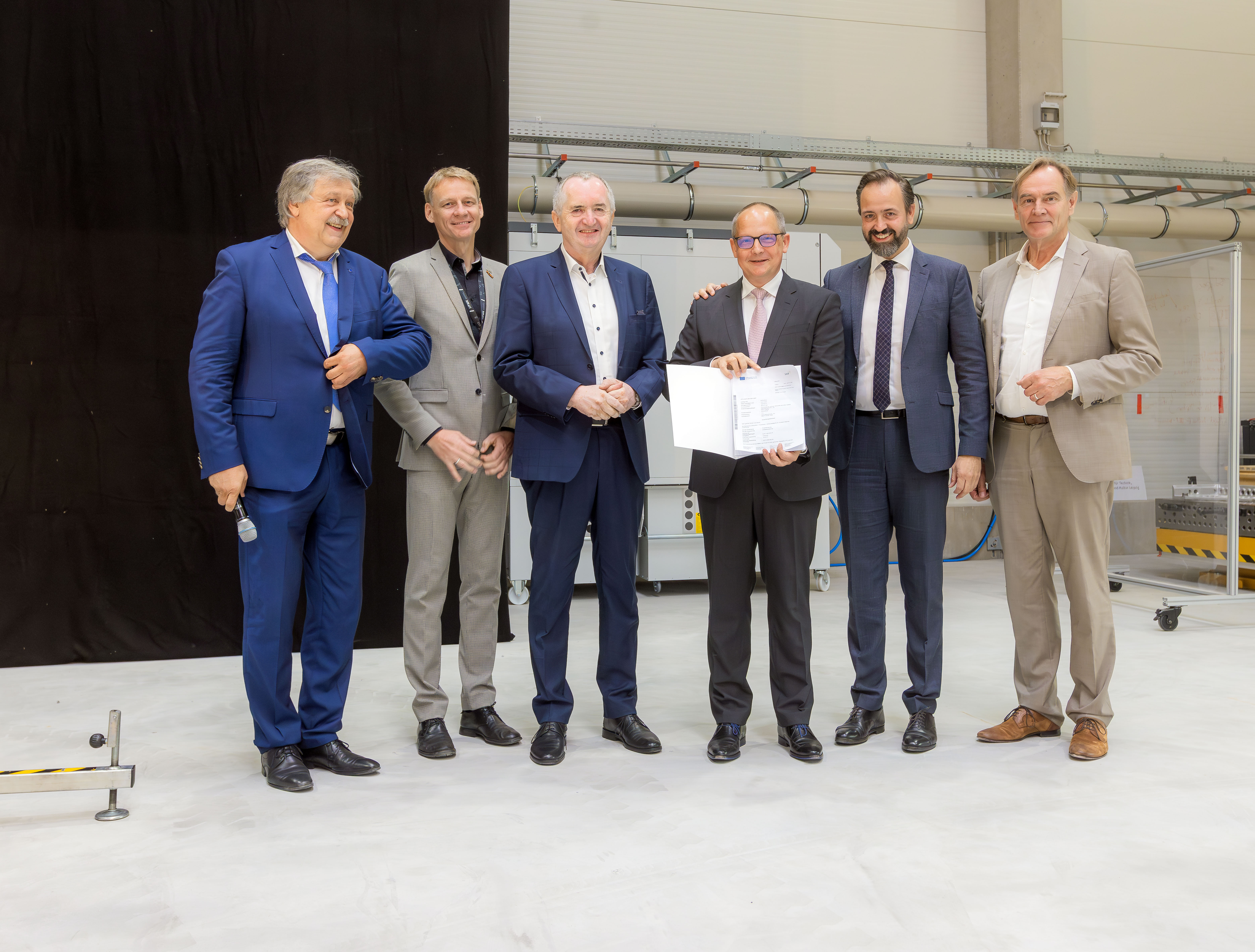 Der sächsische Staatsminister für Wissenschaft Sebastian Gemkow sprach bei der Eröffnung über gemeinsame Forschung zwischen Hochschulen und regionaler Wirtschaft mit Investitionen zur Zukunftssicherung des Freistaates. „Das HolzBauForschungsZentrum wurde bewusst an diesem Standort errichtet, um Innovationen schnell in den Markt zu bekommen. Es wird Sachsen als Standort einer innovativen Holzbauforschung mit deutschlandweiter Strahlkraft neu definieren.“ Gemeinsam mit seinem Kollegen Thomas Schmidt, Sachsens Staatsminister für Regionalentwicklung, übergab er der HTWK Leipzig vor Ort einen Zuwendungsbescheid über fünf Millionen Euro aus dem europäischen Just Transition Fund. Mit Hilfe der Förderung werden hochsensible, digital gesteuerte Fertigungsanlagen angeschafft und so der Wissens- und Technologietransfer von der angewandten Wissenschaft in die Praxis beschleunigt. Dazu Staatsminister Thomas Schmidt: „Die Investition ist eingebettet in die Holzbauinitiative des Freistaats Sachsen. Holz ist ausreichend hier in Sachsen vorhanden. Unser Ziel ist es, diesen nachwachsenden und nachhaltigen Baustoff als starken Treiber eines nachhaltigen Bauens zu verankern.“