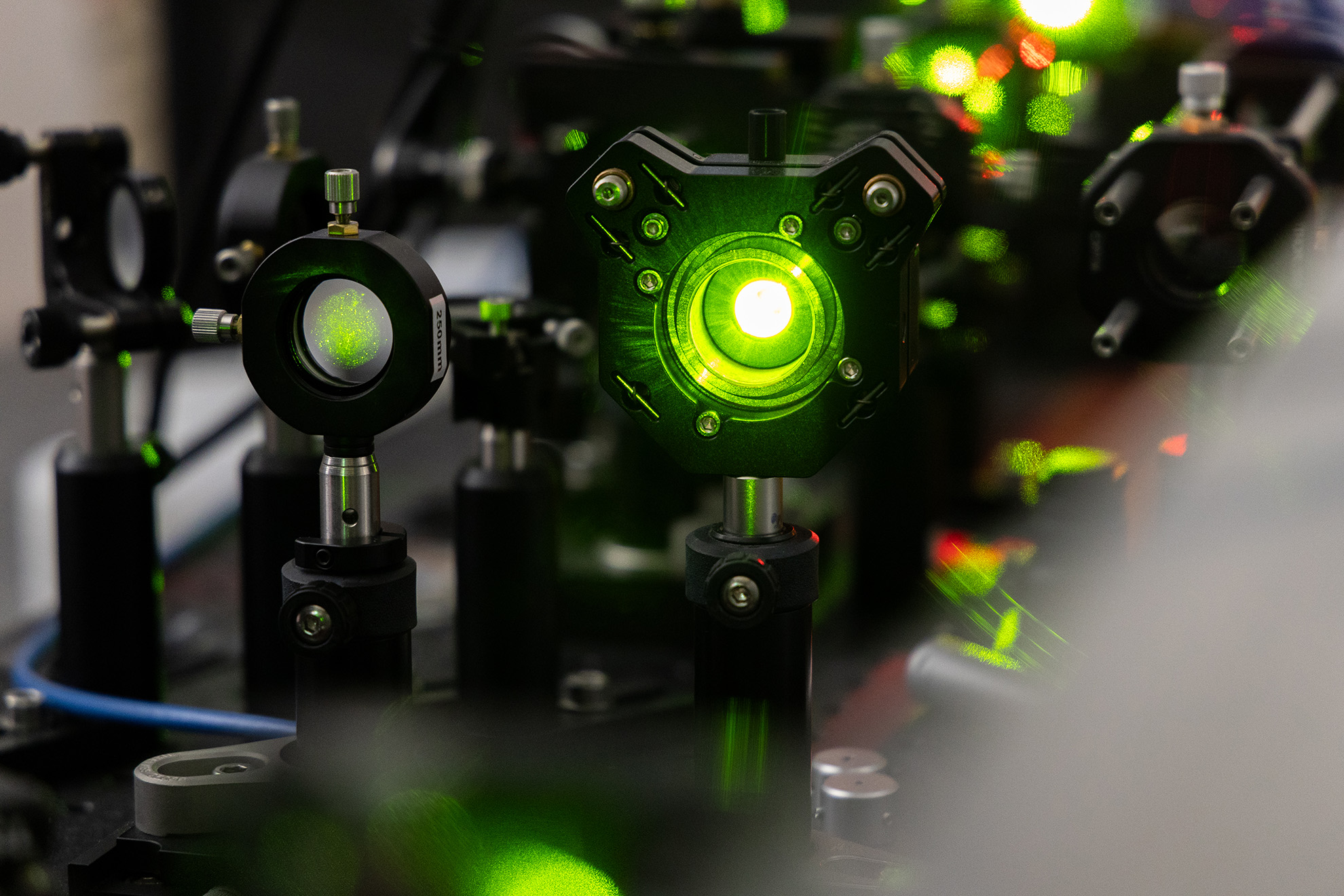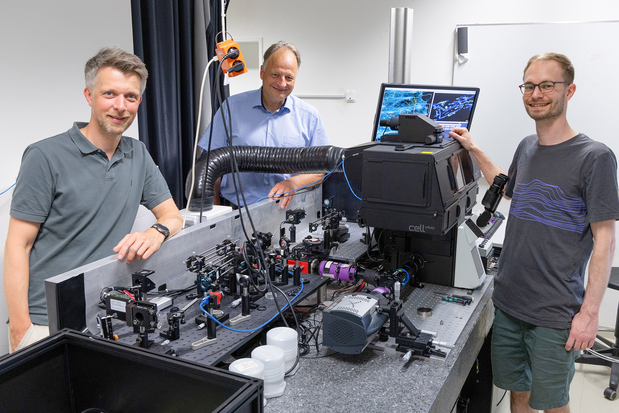 Die Forscher unter der Leitung von Dr. Rainer Kurre und Prof. Dr. Jacob Piehler kombinierten hierfür zwei hochauflösende Mikroskopietechniken zu einem einzigartigen neuen System. „Ein besonderes Merkmal des neuen Mikroskops ist die extrem homogene Laserbeleuchtung, die eine direkte Visualisierung der Bildung von einzelnen Proteinkomplexen in der Zellmembran ermöglicht“, erläutert Dr. Kurre. „Mit diesem Mikroskop können wir jetzt sehr viel tiefere Einblicke in die Signalaktivierung von Immunrezeptoren gewinnen, und so die mechanistischen Prinzipien von Leukämie und Autoimmunerkrankungen aufklären“, erklärt Prof. Jacob Piehler. Dr. Kurre, der die Integrated Bioimaging Facility (iBiOs) am CellNanOs leitet, ist davon überzeugt, dass das neue Mikroskop in der biologischen Forschung am Fachbereich Biologie/Chemie, am CellNanOs und darüber hinaus Einsatz finden wird: „Unsere Forschungsverbünde im Bereich der molekularen Membranbiologie, der Sonderforschungsbereich 'Funktionelle Plastizität kodiert durch Zelluläre Membrannetzwerke' und das Graduiertenkolleg 'nanomaterials@biomembranes', werden davon erheblich profitieren können.“