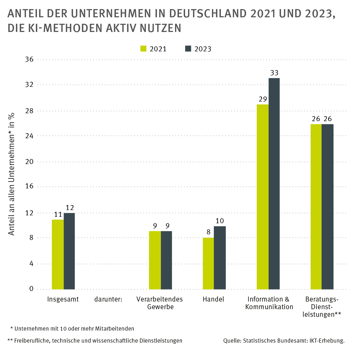 Im Jahr 2023 nutzten zwölf Prozent der gewerblichen Unternehmen in Deutschland KI für ihre Geschäftstätigkeit. 2021 waren es mit elf Prozent nur ein Prozentpunkt weniger. Der Zuwachs geht auf die Informations- und Kommunikationsbranche sowie den Handel zurück.