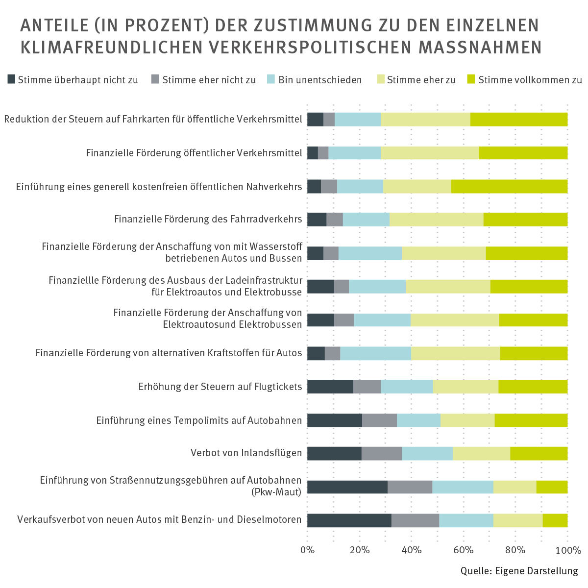 Das faktische ‚Verbrennerverbot‘ und die Einführung einer Pkw-Maut auf Autobahnen werden dagegen eher abgelehnt. Bemerkenswert beim umstrittenen ‚Verbrennerverbot‘ ist jedoch, dass es lediglich von weniger als einem Drittel der Befragten strikt abgelehnt wird, so dass sich dessen Akzeptanz eventuell durch eine bessere politische Kommunikation oder begleitende Maßnahmen erhöhen könnte.“