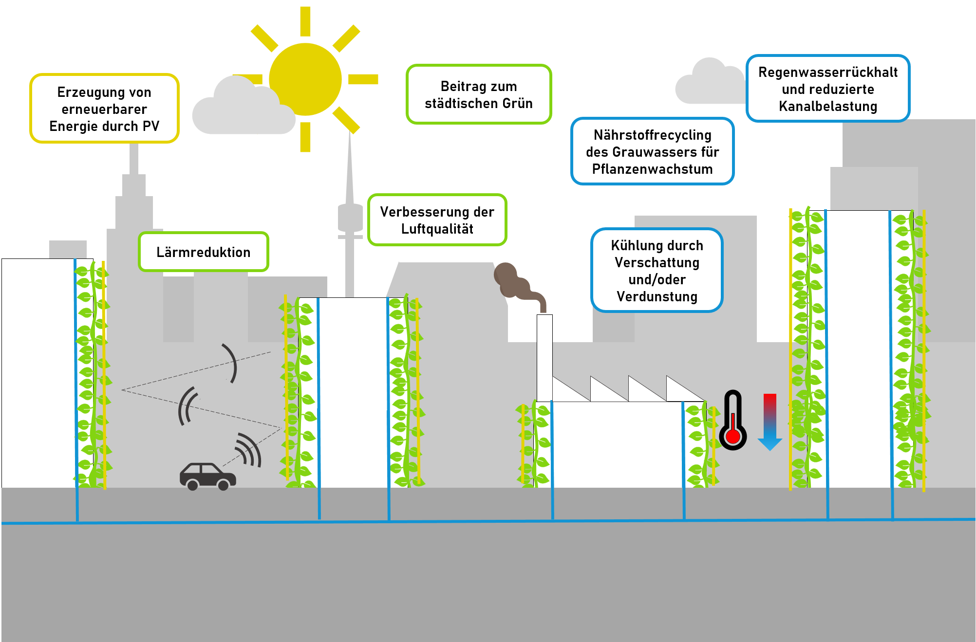 Extreme Hitzewellen stellen für die Bevölkerung Europas im Sommer zunehmend eine Herausforderung dar: Besonders in Städten ist es schon jetzt häufig wärmer als auf dem Land. Gründe dafür sind unter anderem die dichte Bebauung und fehlende Grünflächen im urbanen Raum. Um den Grünflächenanteil in Städten schnell und platzsparend zu erhöhen, setzen Expert*innen aus Wissenschaft, Technik, Umwelt und Lokalpolitik auf eine neuartige Fassadenbegrünung: VertiKKA – die vertikale Klima-Klär-Anlage.