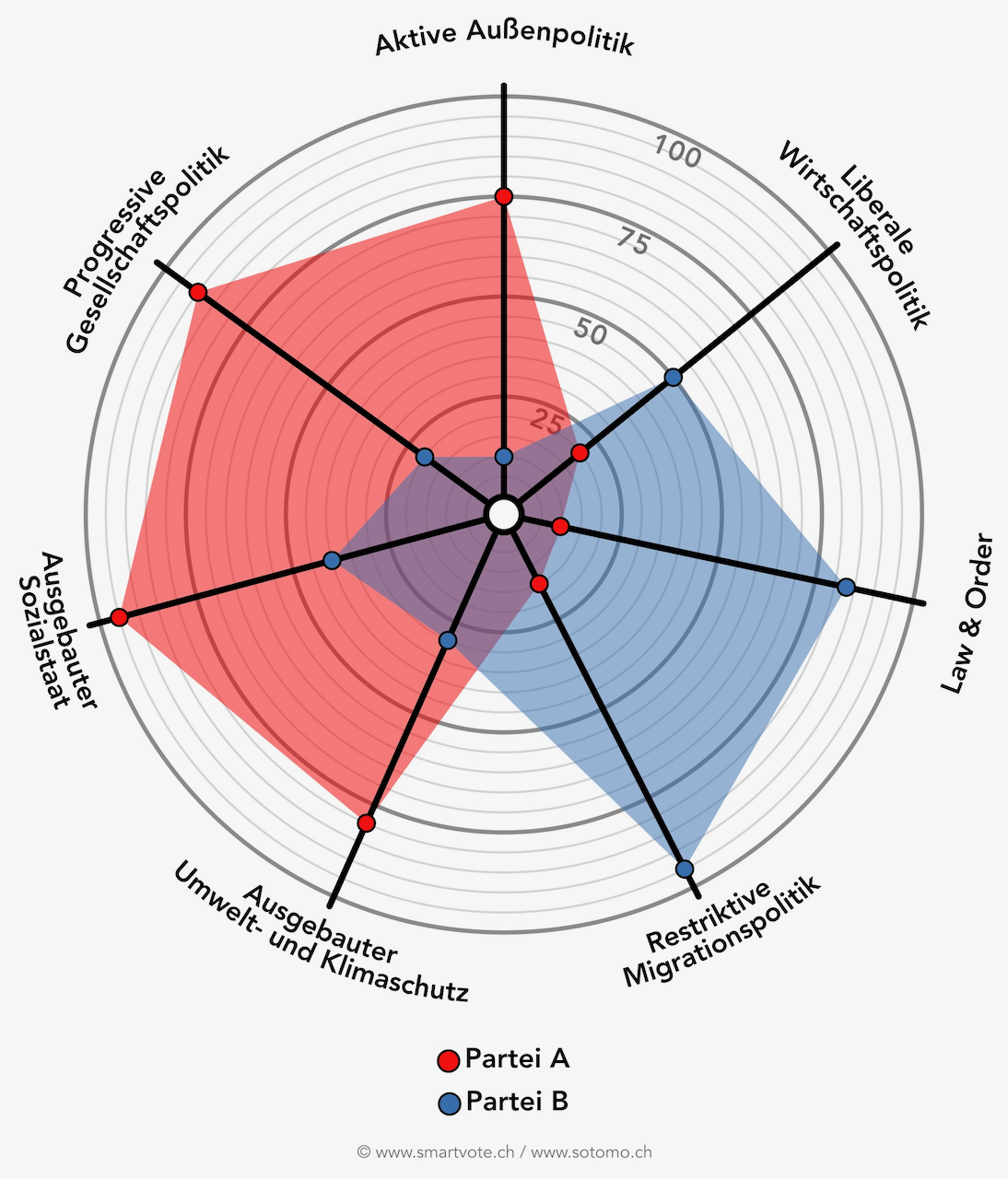 Neben einer Liste, die die Übereinstimmung der eigenen Antworten mit jenen der Parteien präsentiert, gibt es auch weitere hilfreiche Darstellungen: Die smartmap etwa visualisiert die Positionen der politischen Parteien auf zwei Achsen. Die erste Achse zeigt, ob Parteien mehr oder weniger staatlichen Eingriff in die Wirtschaft befürworten, während die zweite Achse ihre Haltung zu gesellschaftspolitischen Fragen von konservativ bis liberal darstellt. Die smartspider-Grafik geht noch einen Schritt weiter. Sie stellt sowohl die Parteien als auch die Positionen der Wähler*innen auf sieben Achsen dar, die verschiedene politische Bereiche abdecken.