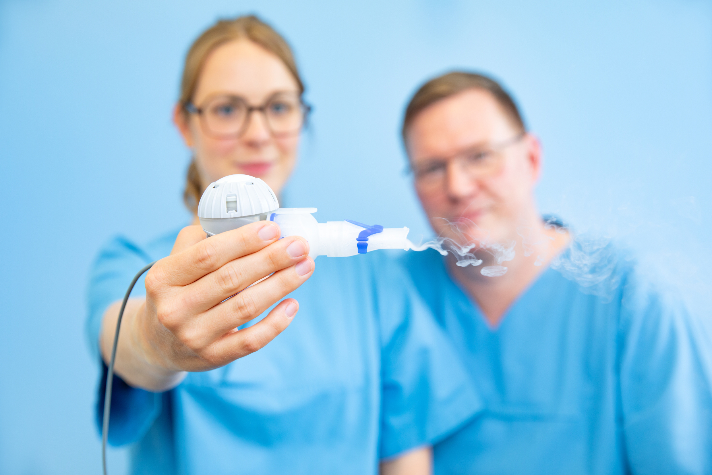 Die Studie HELP-PCD soll aufklären, welchen Effekt das Inhalieren mit hypertoner, sechsprozentiger Kochsalzlösung im Vergleich zur Inhalation mit isotonischer, 0,9-prozentiger Kochsalzlösung hat. Dabei setzen die Forschenden zudem einen speziellen Membranvernebler ein, der die Inhalationszeit von 20 auf etwa vier Minuten reduziert. „Der Schnellvernebler ist nahezu geräuschlos, klein und mobil einsetzbar und macht es für die Patientinnen und Patienten einfacher, das Inhalieren in ihrem Alltag unterzubringen“, sagt Professor Ringshausen, Leiter der Spezialambulanzen für Bronchiektasen-Erkrankung, PCD und Mukoviszidose. Die Teilnehmenden inhalieren jeweils acht Wochen lang erst mit der einen, dann mit der anderen Kochsalzlösung, ohne deren Konzentrationen zu kennen. Ihre Lungenfunktion wird zum einen über den Lung Clearance Index (LCI) bestimmt, der die Lungenbelüftung misst, und zum anderen mit Hilfe bildgebender Verfahren wie der Magnetresonanztomografie (MRT) ermittelt. Das Deutsche Zentrum für Lungenforschung (DZL) fördert die Studie mit rund 600.000 Euro.