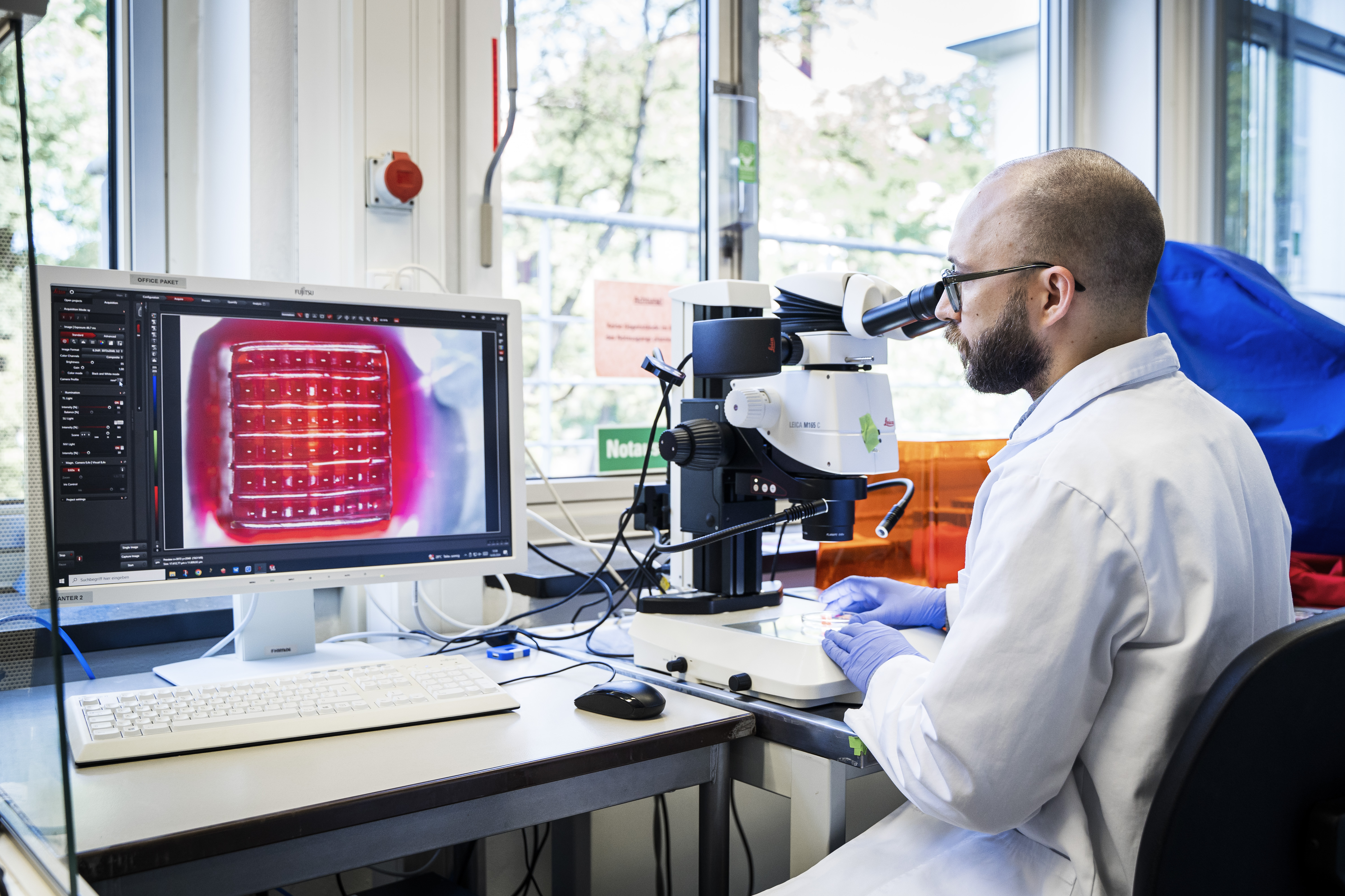 „Die größte Herausforderung lag in der Schaffung geeigneter Umgebungsbedingungen,“ erinnert sich Kaufmann: Für die Verarbeitung von Proteinen und Zellen benötigt man neben hoher Luftfeuchtigkeit auch gleichmäßige 37 Grad Celsius. Nach ausgiebigen Tests entschieden sich die Forschenden für eine effiziente und kostengünstige Lösung: Heizfolien, an das Alugehäuse des Druckers geklebt und gesteuert durch einen Mikrocontroller, heizen den Innenraum auf die gewünschte Temperatur auf. Dabei erzeugt wassergetränkter Zellstoff eine Luftfeuchtigkeit von über 90 Prozent. Außerdem ersetzten die Forschenden die Druckplattform des Druckers, auf der schichtweise Strukturen aufgebaut werden: Bei handelsüblichen Druckern, die Kunststoff verarbeiten, ist diese Platte aus Metall. Der modifizierte 3D-Printer verfügt über eine Aufhängung, an der sich ein Glasplättchen befestigt lässt. Auf dieses lichtdurchlässige Plättchen können Biomaterialien und Zellen direkt aufgedruckt und anschließend hochauflösend unter dem Mikroskop untersucht werden.