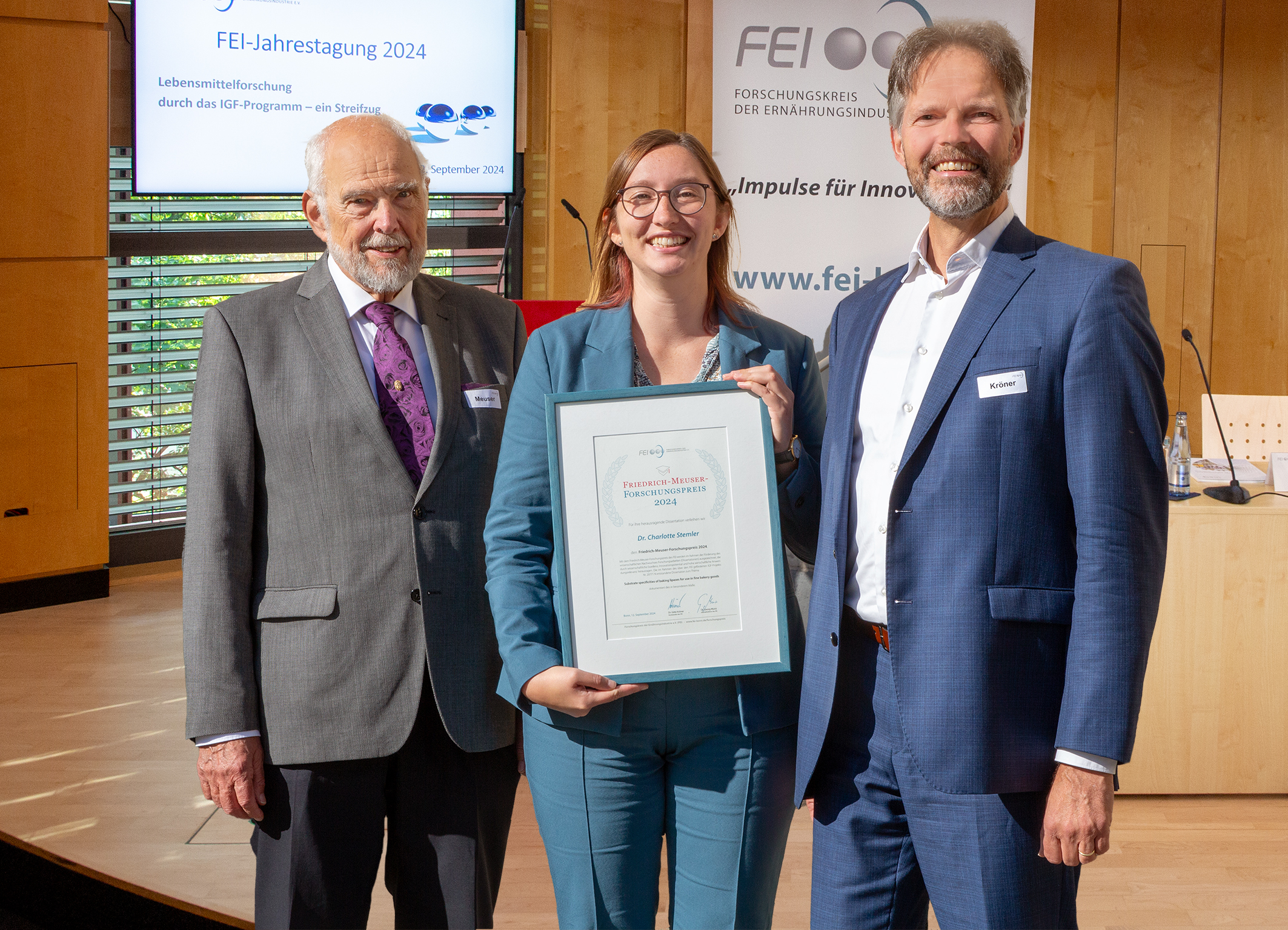 Der Forschungspreis wurde Dr. Charlotte Stemler im Rahmen der FEI-Jahrestagung am 12. September 2024 in Hamburg durch den FEI-Vorsitzenden Dr. Götz Kröner überreicht.