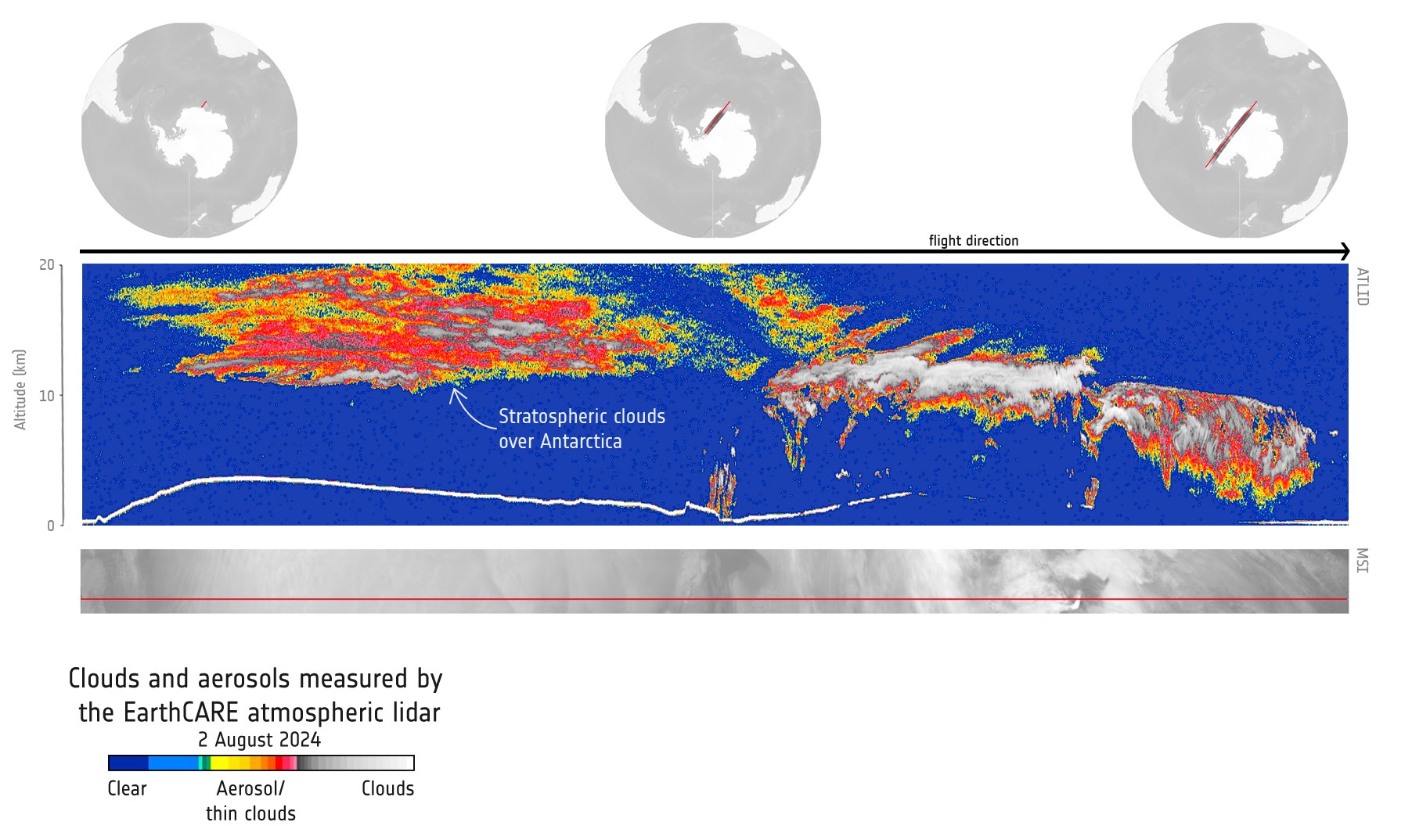 The first images from August show the diversity of aerosols and clouds in the Earth's atmosphere: for example, a profile of Polar Stratospheric Clouds (PSC) over Antarctica, which play an important role in the formation of ozone holes, or Tropical Storm Debby over the Gulf of Mexico, and plumes of smoke from forest fires in Canada. Simonetta Cheli, ESA's Director of Earth Observation Programmes, said: “Following on from the first images from EarthCARE’s other three instruments, we can now also see how well the atmospheric lidar is working. These profiles from the atmospheric lidar come exactly as we had anticipated, after the instrument has been through its routine decontamination and calibration processes. The atmospheric lidar brings us completely new insight into the vertical distribution of clouds and aerosols and, together with the other instruments, puts us on course to gaining new scientific understanding into Earth’s energy balance.”