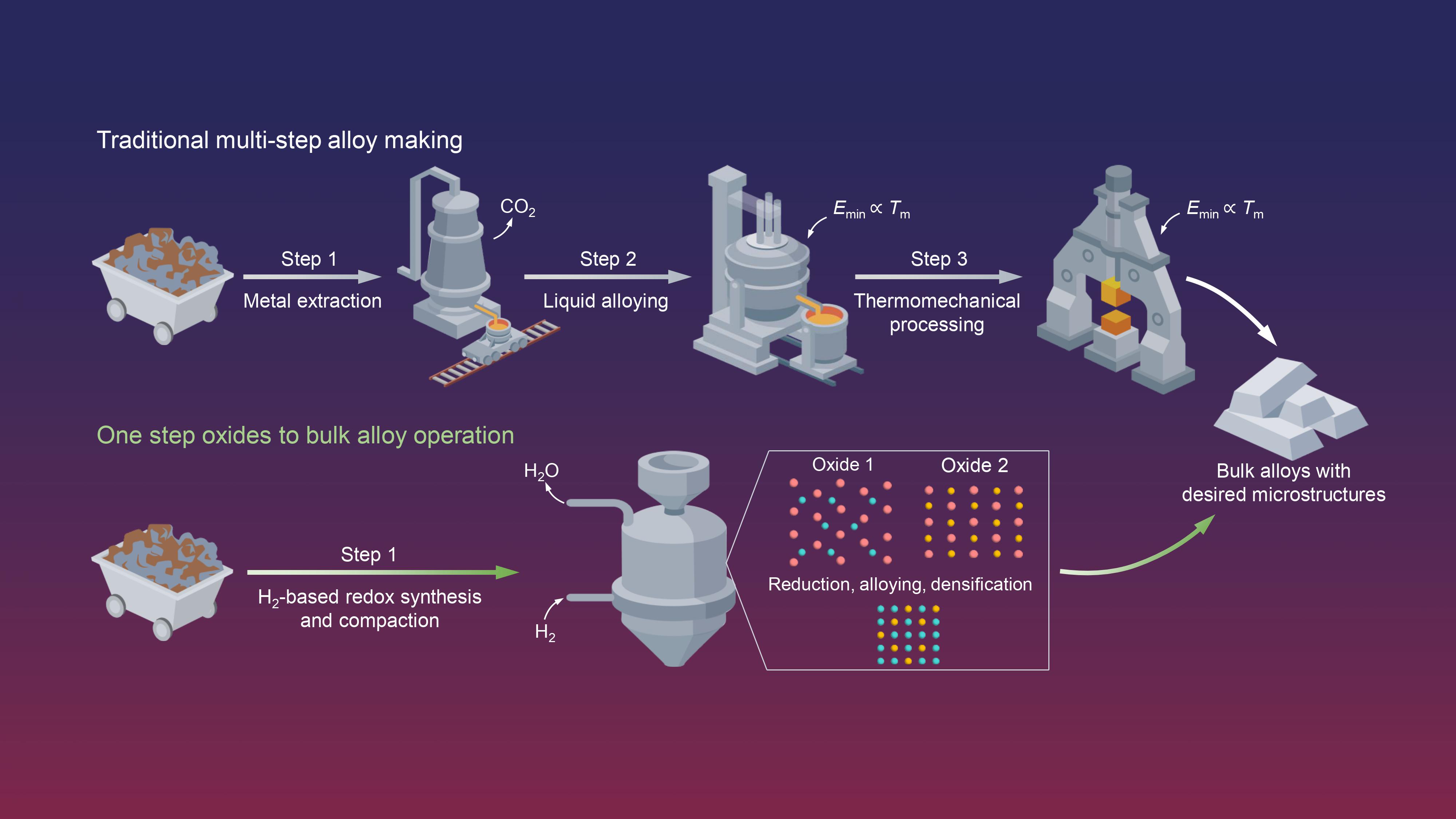 “We asked ourselves: can we produce an alloy with near-optimized microstructure-property combination directly from ores or oxides with zero CO2 emission?” says Dr. Shaolou Wei, Humboldt research fellow at MPI-SusMat and first author of the publication. Conventional alloy production is typically a three-step process: first, reducing ores to their metallic form, then mixing liquified elements to create the alloy, and finally applying thermomechanical treatments to achieve the desired properties. Each of these steps is energy-intensive and relies on carbon as both an energy carrier and a reducing agent, resulting in significant CO2 emissions. “The key idea is to understand the thermodynamics and kinetics of each element and use oxides with similar reducibility and mixability at around 700°C,” Shaolou continues, “This temperature is far below the bulk melting point, which still allows us to extract metals from their oxide states and mix into alloys via one single solid-state process step without reheating.” Unlike conventional methods where ores are reduced using carbon, which results in carbon-contaminated metals, the team’s new method uses hydrogen as the reducing agent. “Using hydrogen instead of carbon brings four key advantages,” explains Professor Dierk Raabe, managing director at MPI-SusMat and corresponding author of the study. “First, the hydrogen-based reduction only produces water as a byproduct, meaning zero CO2 emissions. Second, it yields pure metals directly, eliminating the need to remove carbon from the final product, thus saving time and energy. Third, we do the process at comparably low temperatures, in the solid state. Fourth, we avoid the frequent cooling and reheating characteristic of conventional metallurgical processes.”
