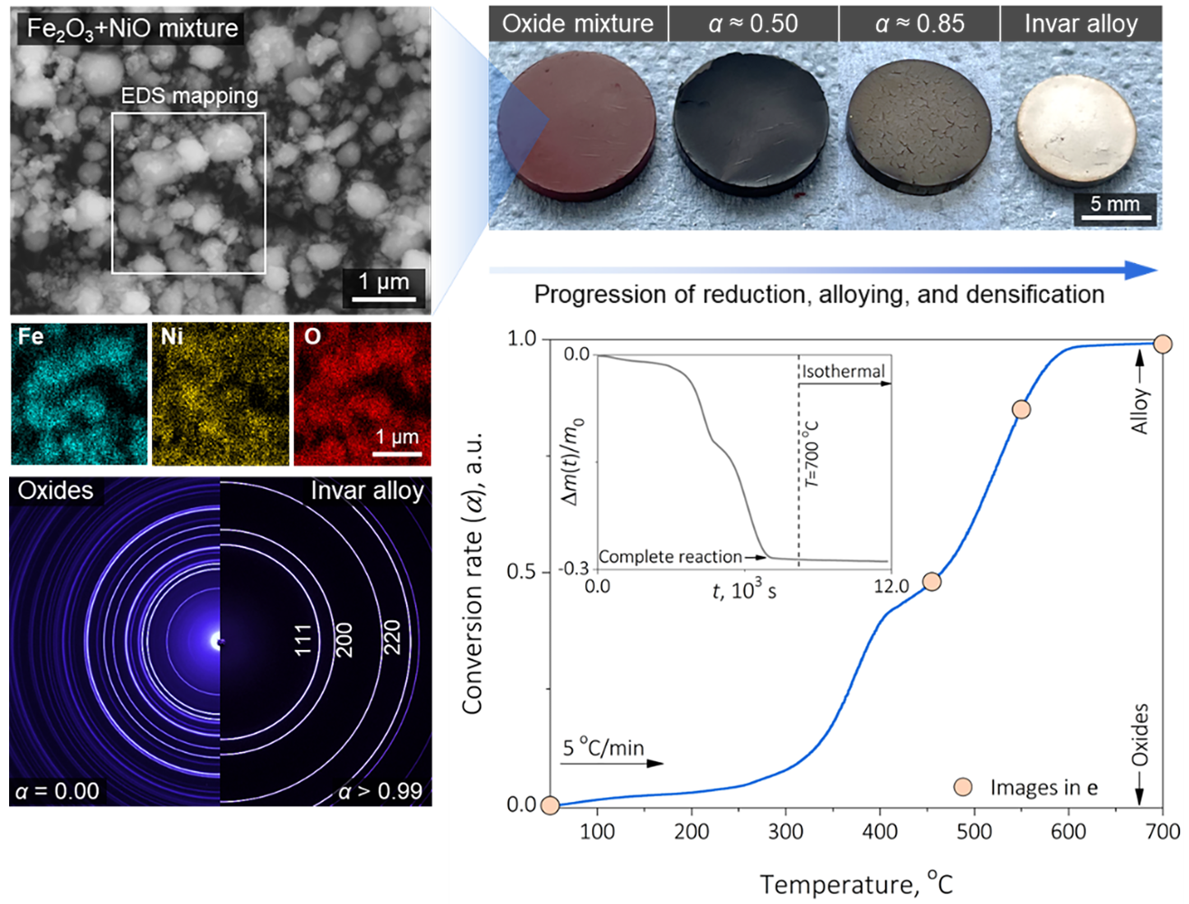 Metal production is responsible for 10% of global CO2 emissions, with iron production emitting two tons of CO2 for every ton of metal produced, and nickel production emitting 14 tons of CO2 per ton and even more, depending on the ore used. These metals form the foundation of alloys that have a low thermal expansion, called Invar. They are critical for the aerospace, cryogenic transport, energy and precision instrument sectors. Recognizing the environmental toll, scientists at the Max Planck Institute for Sustainable Materials (MPI-SusMat) have now developed a new method to produce Invar alloys without emitting CO2 while saving a vast amount of energy - achieving this in a single-step process that integrates metal extraction, alloying, and thermomechanical processing into a single reactor and process step. Their approach dissolves some of the classical boundaries between extractive and physical metallurgy, inspiring direct conversion from oxides to application-worthy products in one single solid-state operation. Their findings were published in the journal Nature.