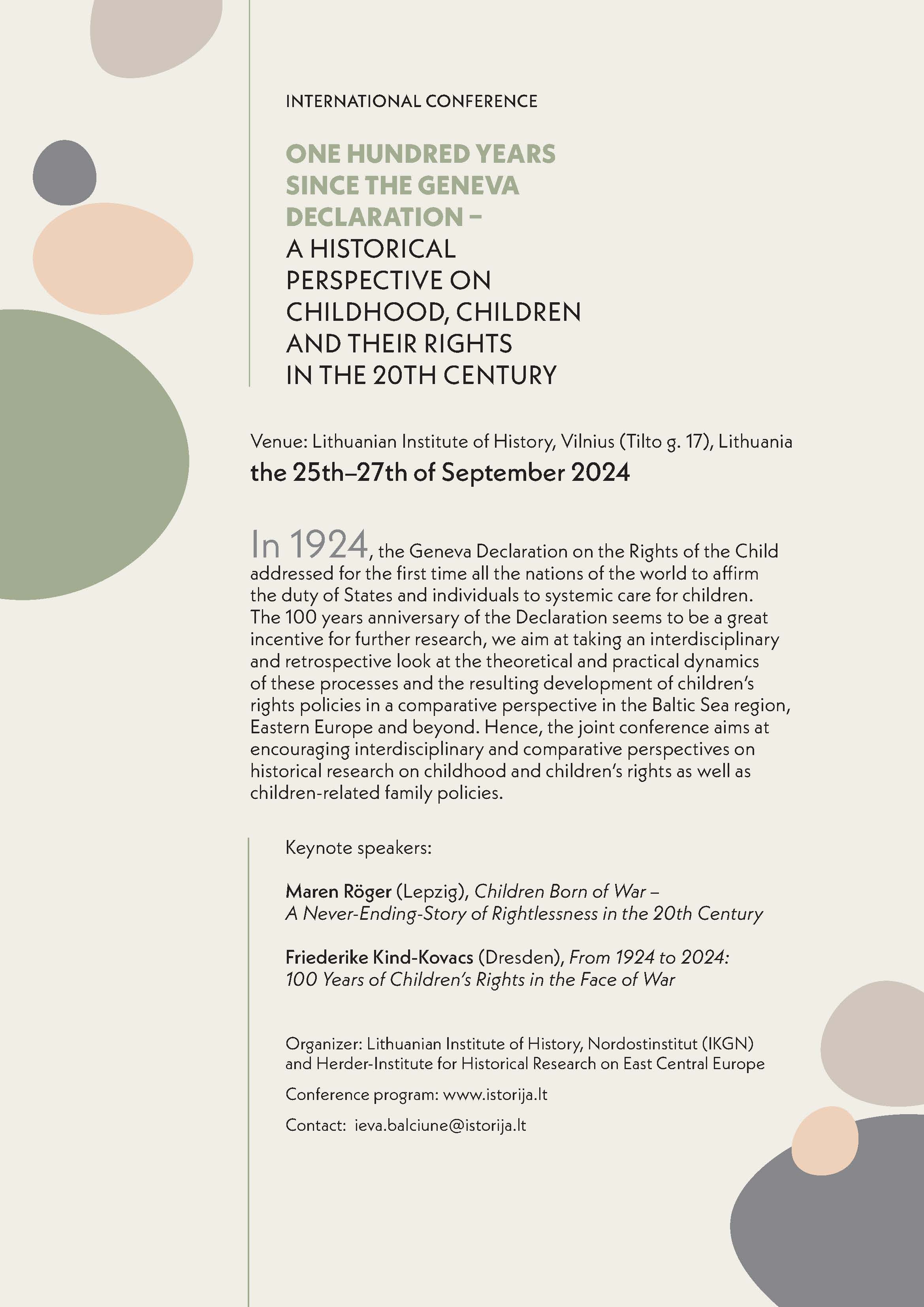 In 1924, the Geneva Declaration on the Rights of the Child addressed for the first time all the nations of the world to affirm the duty of States and individuals to systemic care for children. The Declaration set out 5 points covering aspects of: children‘s physical and mental health, safety, support, and the development and fulfillment of their talents and abilities. 100 years after the Declaration, the young scholars conference invites to explore the development and implementation of the law of children and childhood protection, everyday practices, issues and challenges from the perspective of social history with a focus on the 19th century. But already since the demographic revolution of the late 19th century, the view of the relation between families children and states had changed dramatically. Children were seen as a crucial element of the state‘s power, and their position in their families became a topic of public interest. These aspects have become of research interest lately. So, children‘s and childhood history has become a recent trend in historiography, combining family and social history. Nevertheless, Eastern Europe and the Baltic Sea region seem to be under-researched in this respect.
