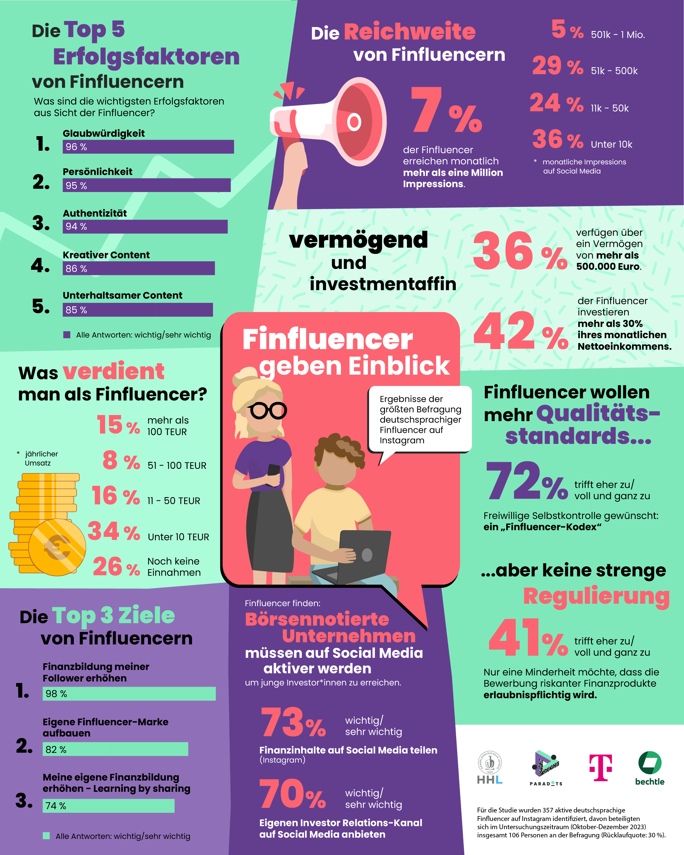 Das Forschungsprojekt „Finfluencer Relations“ zur Kooperation zwischen Finfluencern auf Instagram und börsennotierten Unternehmen wird von der HHL Leipzig Graduate School of Management in Zusammenarbeit mit Paradots durchgeführt und befragt 106 Finanz-Influencer. Unterstützt wird die Studie von den Investor Relations-Abteilungen von Bechtle und der Deutschen Telekom. Als bislang umfassendste Untersuchung dieser Art im deutschsprachigen Raum befindet sie sich derzeit im Peer-Review-Prozess eines international renommierten Journals. Die Datenerhebung erfolgte im Zeitraum von Oktober bis Dezember 2023. Bereits Anfang Februar 2024 analysierten die Forschungspartner im Rahmen einer Vorstudie die Profile aktiver deutschsprachiger Finfluencer auf Instagram: https://www.mynewsdesk.com/de/hhl-gemeinnutzige-gmbh/pressreleases/finfluencer-studie-forschungsprojekt-gibt-ueberblick-ueber-deutschsprachige-finanz-influencer-3301845