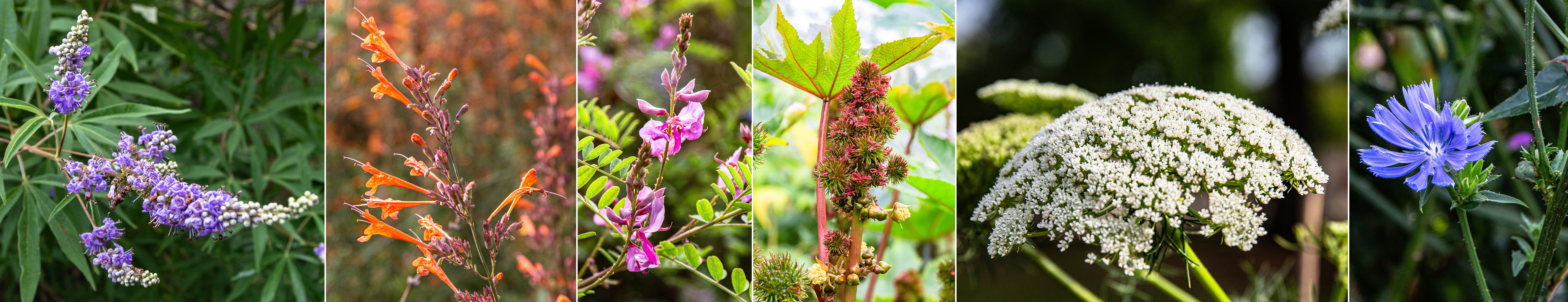 Ins Auge fällt der Blutweiderich (Lythrum salicaria), dessen mit unzähligen lila Blüten bedeckte Triebe über drei Meter aufragen. Die Pflanze wurde früher zum Gerben von Leder genutzt, hat aber auch medizinische Wirkungen. Der violett blühende Mönchspfeffer (Vitex agnus-castus) wirkt bei Geschlechtskrankheiten; in Klöstern wurde er früher auch als „Anti-Aphrodisiakum“ genutzt, da er die sexuelle Begierde senkt. Die orangenen Blüten der Duftnessel (Agastache aurantiaca) sind süß und essbar, die Indigopflanze (Indigofera tinctoria) ist für ihren Farbstoff bekannt, der unter anderem Jeans blau färbt.
