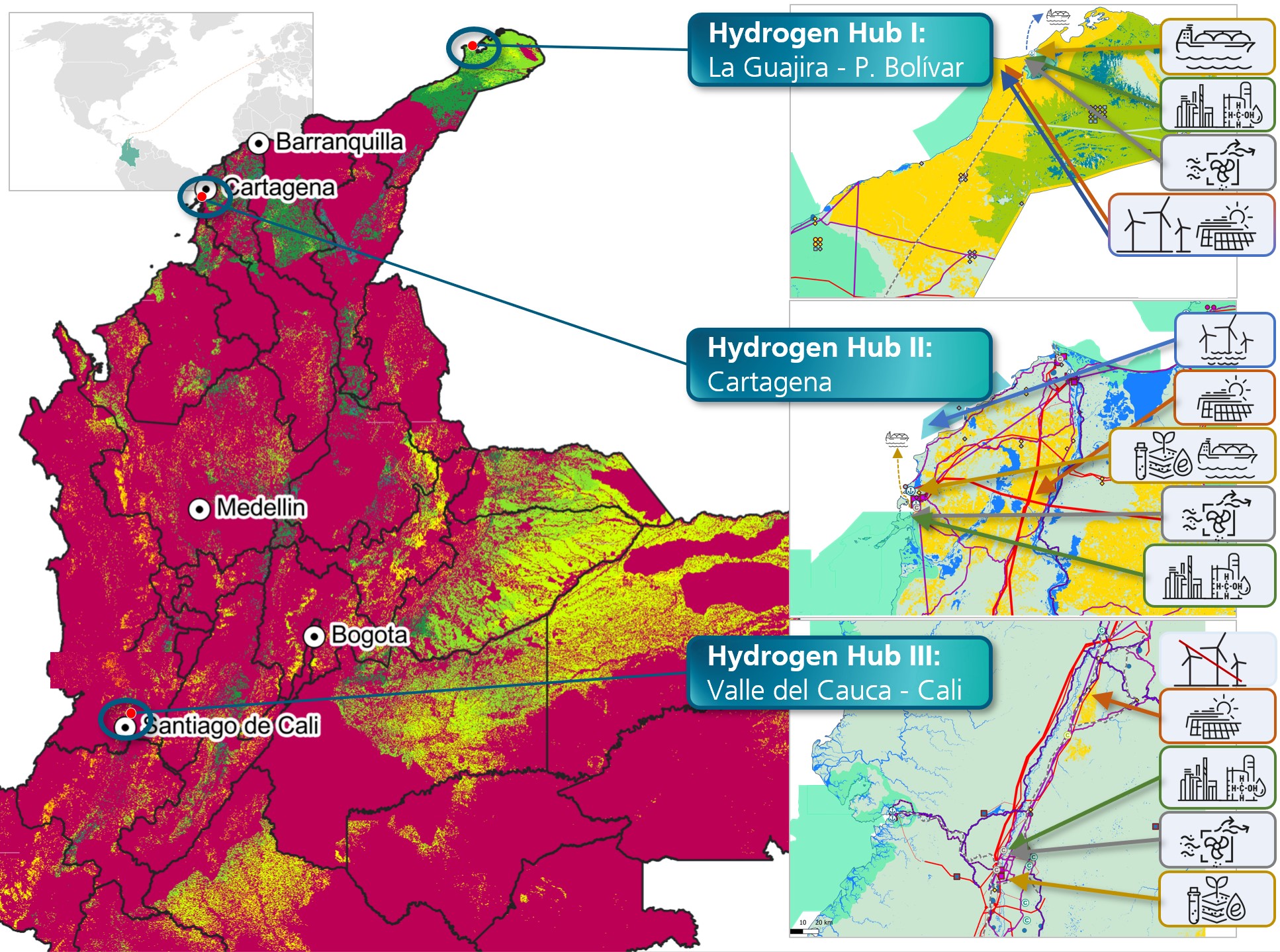 Kolumbien verfügt über ein enormes Potenzial an erneuerbaren Energien: Wasserkraft, Biomasse, Solar- und Windenergie, sowohl auf dem Festland als auch vor der Küste. In einer techno-ökonomischen Studie des Fraunhofer ISE, die 2023 im Auftrag der H2Global-Stiftung die Produktions- und Transportkosten von Power-to-X-Produkten für das Jahr 2030 in 39 Regionen weltweit untersuchte, stachen unter anderem Gebiete in Nordkolumbien hervor.