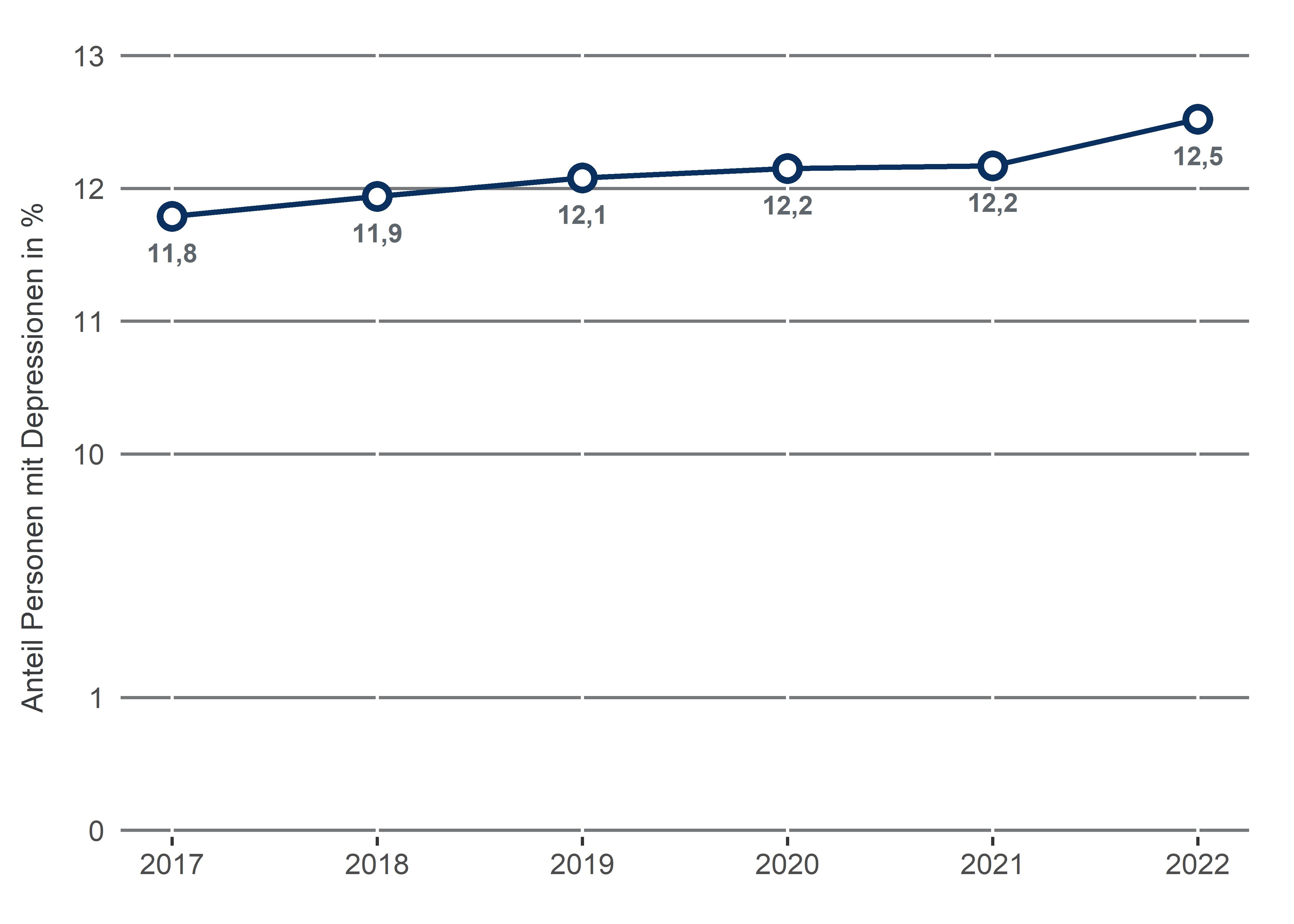 Rund 9,49 Millionen Menschen in Deutschland waren laut dem aktuellen „Gesundheitsatlas Deutschland“ des Wissenschaftlichen Instituts der AOK (WIdO) 2022 von Depressionen betroffen. Die Prävalenz der diagnostizierten Erkrankungen ist in den vergangenen fünf Jahren kontinuierlich gestiegen und hat zuletzt mit 12,5 Prozent einen neuen Höchststand erreicht. In den Pandemiejahren ist ein Anstieg insbesondere bei jüngeren Menschen zwischen 10 und 24 Jahren sowie bei den Älteren über 65 Jahre zu erkennen.