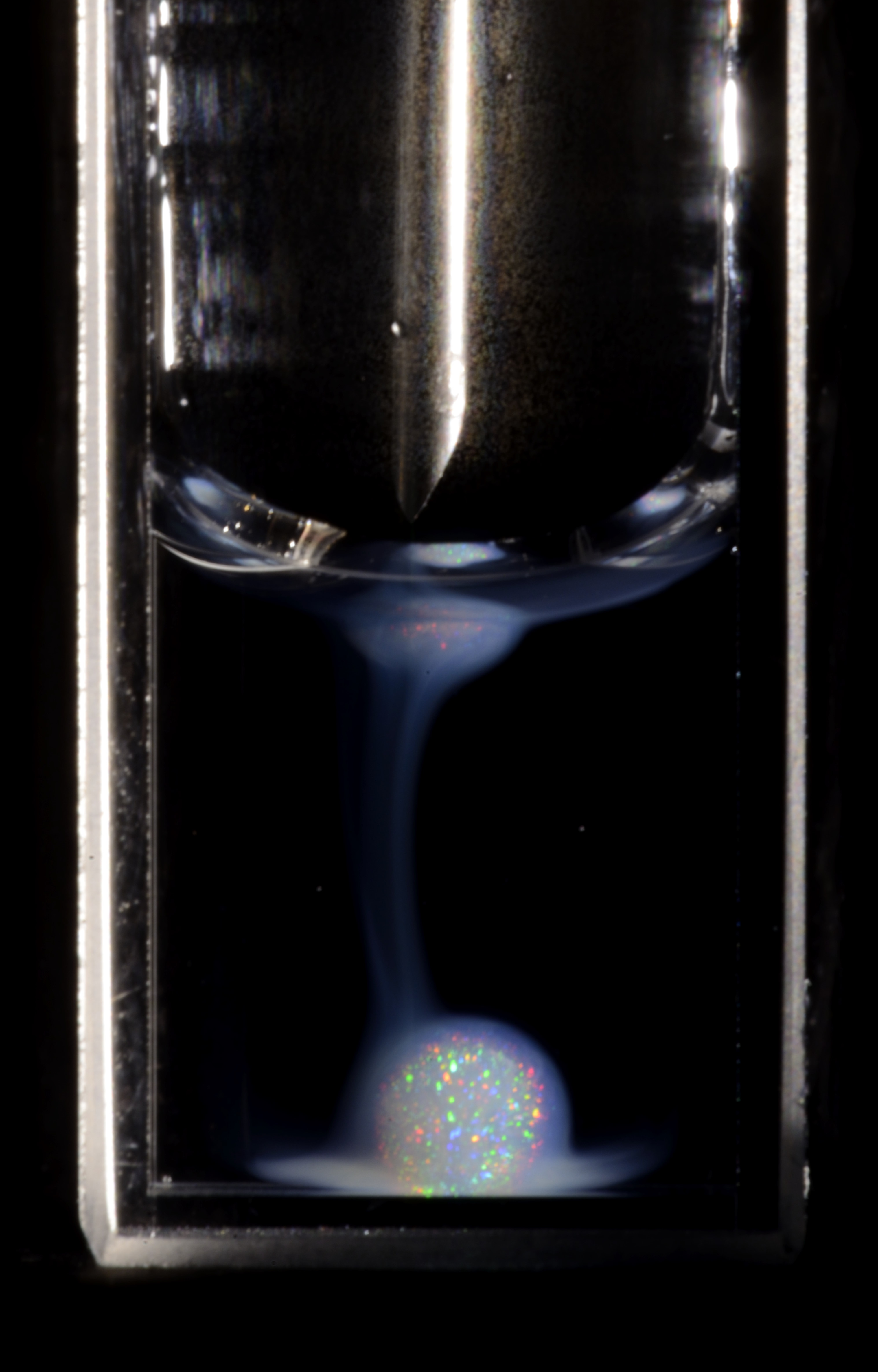 Gibt man einen Tropfen Tinte in Wasser, ist klar, was passiert: Er verteilt sich mit der Zeit. Doch wie verhält sich ein kristalliner Tropfen, dessen Teilchen sich gegenseitig abstoßen, wenn er in Wasser schwebt? Vorhersagen zum dreidimensionalen Verhalten eines solchen Tropfens suchte man bislang vergeblich, lediglich einige wenige eher exotische Materialien wurden bisher modelliert – zum Beispiel Plasmen, quasi Sonnenmaterial, dessen Teilchen sich ebenfalls abstoßen. Wo Durchlicht versagt und Röntgen zu aufwendig ist, haben die Forschenden eine Methode entwickelt, die mit einfachsten Labormitteln auskommt. Die Basis dafür bildet das farbliche Glitzern eines solchen Kristalltropfens, das auf farbselektiver Lichtbeugung beruht: Ist der Abstand zwischen den Partikeln groß, schimmert der Tropfen mit weißem Licht bestrahlt leuchtend rot, befinden sich die Partikel dagegen dichter zusammen, funkelt er blau. Über die Farbbestimmung lässt sich somit das Dichteprofil des Tropfens messen. Das Manko: Man muss wissen, in welcher Tiefe des Tropfens sich kristalline Strukturen befinden – ein Ding der Unmöglichkeit, will man sich der Frage mit weißem Licht nähern.