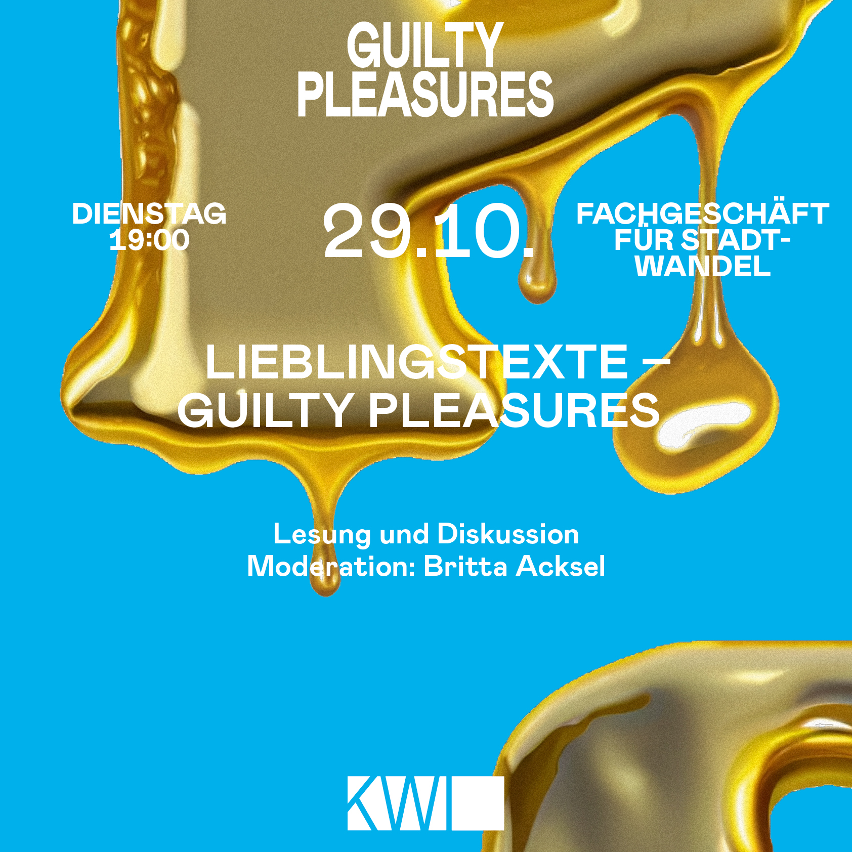 Das Konzept der Reihe ist denkbar einfach: Verschiedene Textausschnitte zum Thema des Abends werden gelesen (maximal zehn Minuten) und im Anschluss gemeinsam mit dem Publikum diskutiert. Am 29. Oktober widmet sich der Abend dem KWI-Jahresthema 2024/25, den „Guilty Pleasures“: Als ein komplexes Gemisch aus Lust, Scham und Reue bilden guilty pleasures eine unübersichtliche Arena gesellschaftlicher und kultureller Auseinandersetzungen. Das KWI-Jahresthema setzt sich zum Ziel, mehr als nur den schlechten Ruf des schuldbesetzten Vergnügens zu erkunden, und geht den vielfältigen Formen, Funktionen und historischen Zusammenhängen dieses Phänomens auf den Grund. Passend dazu lesen die KWI-Kolleg*innen für sie mit schuldhaftem Vergnügen besetzte Texte von Rocko Schamoni, Diane Di Prima, Heinz Strunk u.a.
