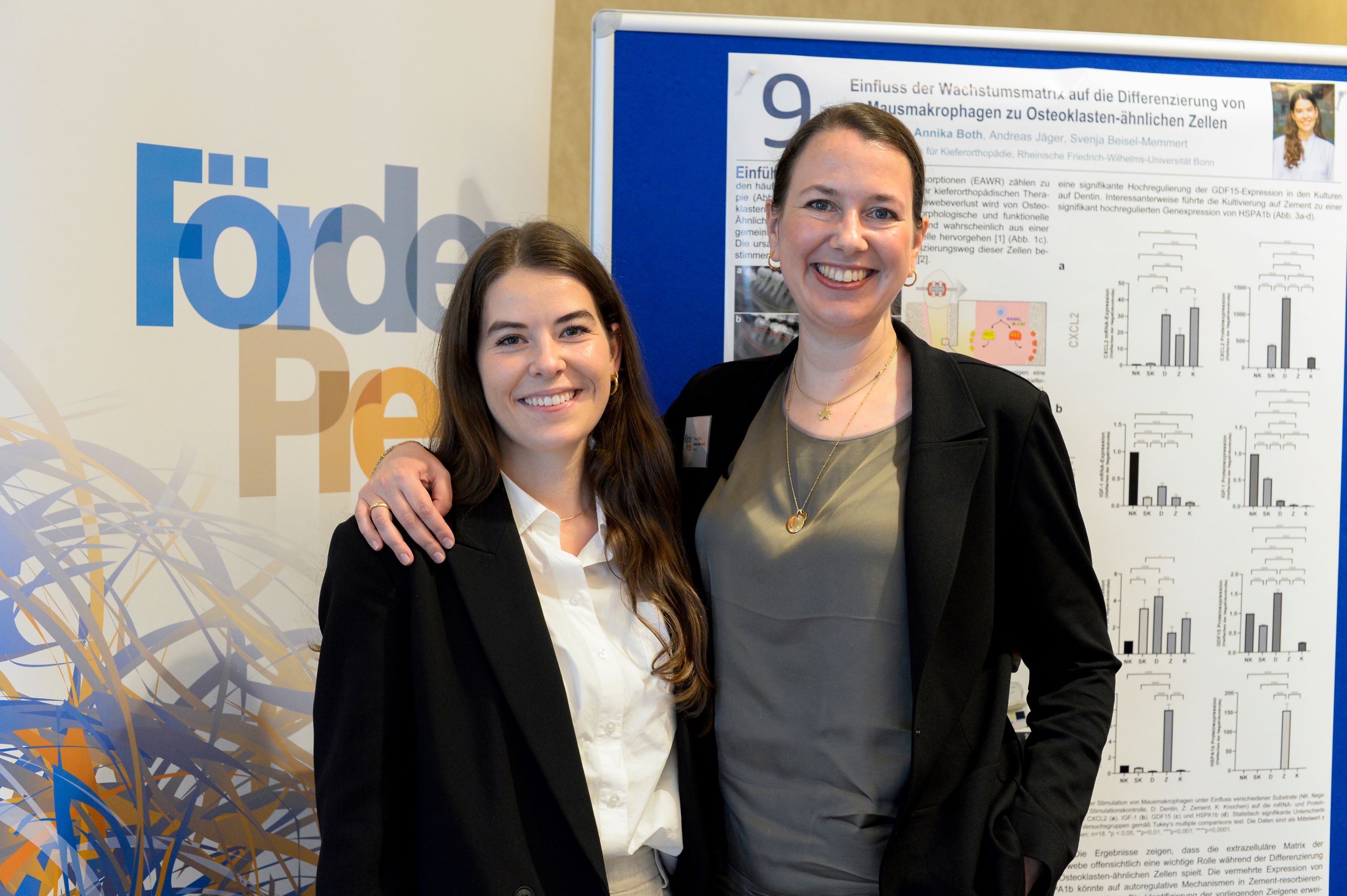 In der Förderpreis-Kategorie „Grundlagenforschung und Naturwissenschaften“ sicherte sich Annika Both, Weiterbildungsassistentin in der Poliklinik für Kieferorthopädie des Universitätsklinikums Bonn, unter der Betreuung von Priv.-Doz. Dr. Svenja Beisel-Memmert den ersten Platz. Die prämierte Posterpräsentation trägt den Titel: „Einfluss der Wachstumsmatrix auf die Differenzierung von Mausmakrophagen zu osteoklastenähnlichen Zellen“.