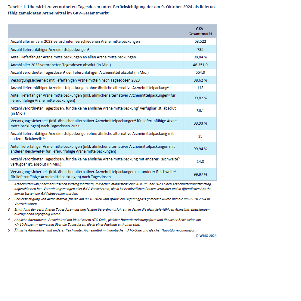 Laut Wissenschaftlichem Institut der AOK (WIdO) gibt es derzeit keine Hinweise darauf, dass Versorgungsengpässe oder Lieferschwierigkeiten bei Arzneimitteln drohen, wie zuletzt zahlreiche Medien berichteten. Von den insgesamt mehr als 63.000 verschiedenen Arzneimitteln, die im Jahr 2023 auf dem Markt erhältlich waren und zu Lasten der gesetzlichen Krankenversicherung verordnet wurden, sind nach aktueller WIdO-Auswertung derzeit lediglich 735 beim Bundesinstitut für Arzneimittel und Medizinprodukte (BfArM) von den pharmazeutischen Herstellern als nicht lieferfähig gemeldet.
