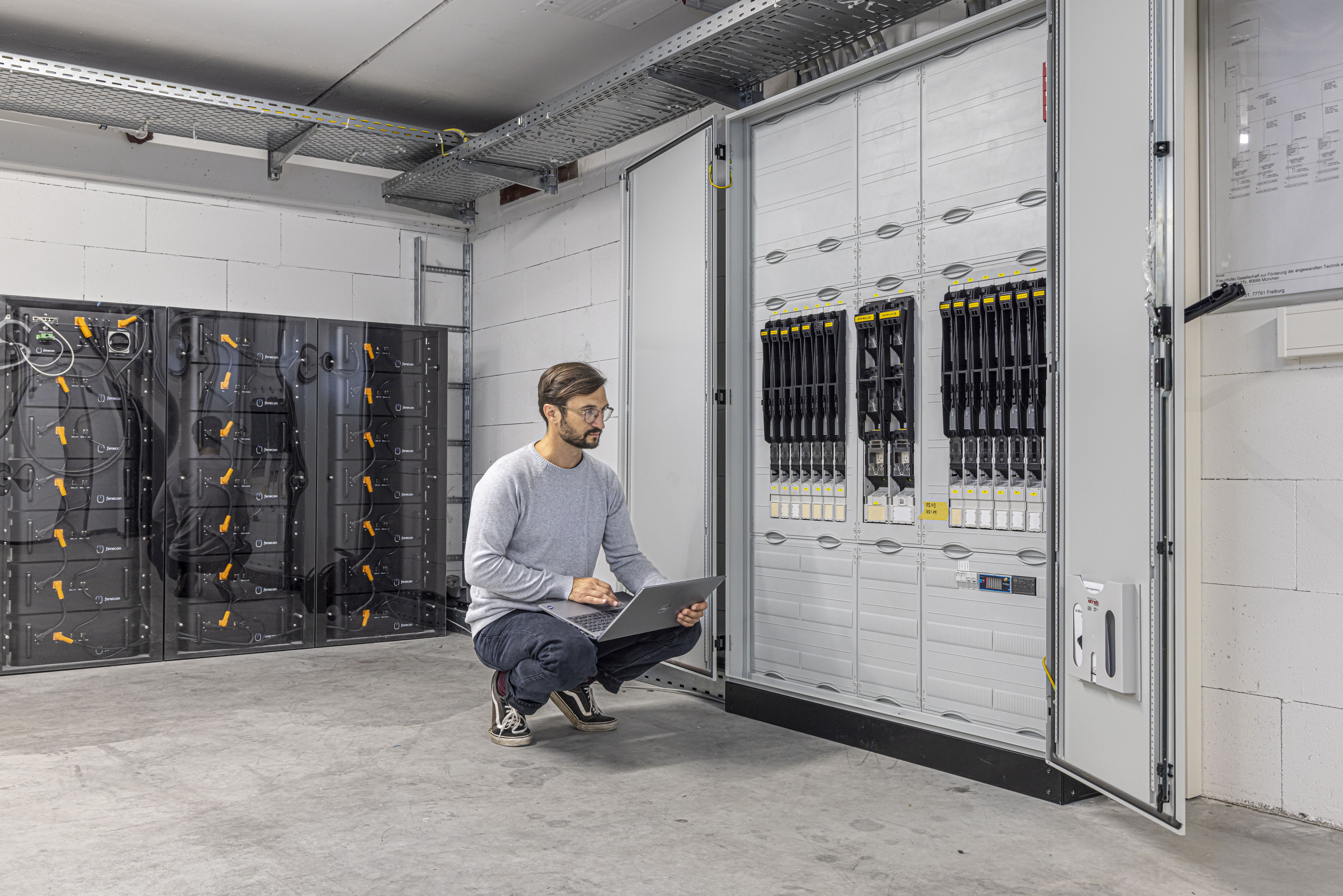 Als »Living-Lab« dient auch das Gebäude selbst der Forschung: Im Projekt »Haid-Power«, das vom Land Baden-Württemberg mit drei Millionen Euro gefördert wurde, erhielt das Zentrum einen modularen Hybrid-Batteriespeicher mit 836 kWh Kapazität, der gemeinsam mit einer 850 Kilowatt- Photovoltaikanlage auf dem Flachdach die Energieversorgung des Gebäudes unterstützt. Unter realen Betriebsbedingungen können so batteriegestützte Lösungen für den gewerblichen und industriellen Einsatz und neue Betriebsstrategien wie z.B. ein intelligentes Lastmanagement getestet werden. So wird im Rahmen des BMBF-geförderten Projekts »ecoLEPuS« eine Schnellladestation mit Pufferspeicher installiert, um Second Life Batterien für den Einsatz in Hochleistungsanwendungen zu erproben.