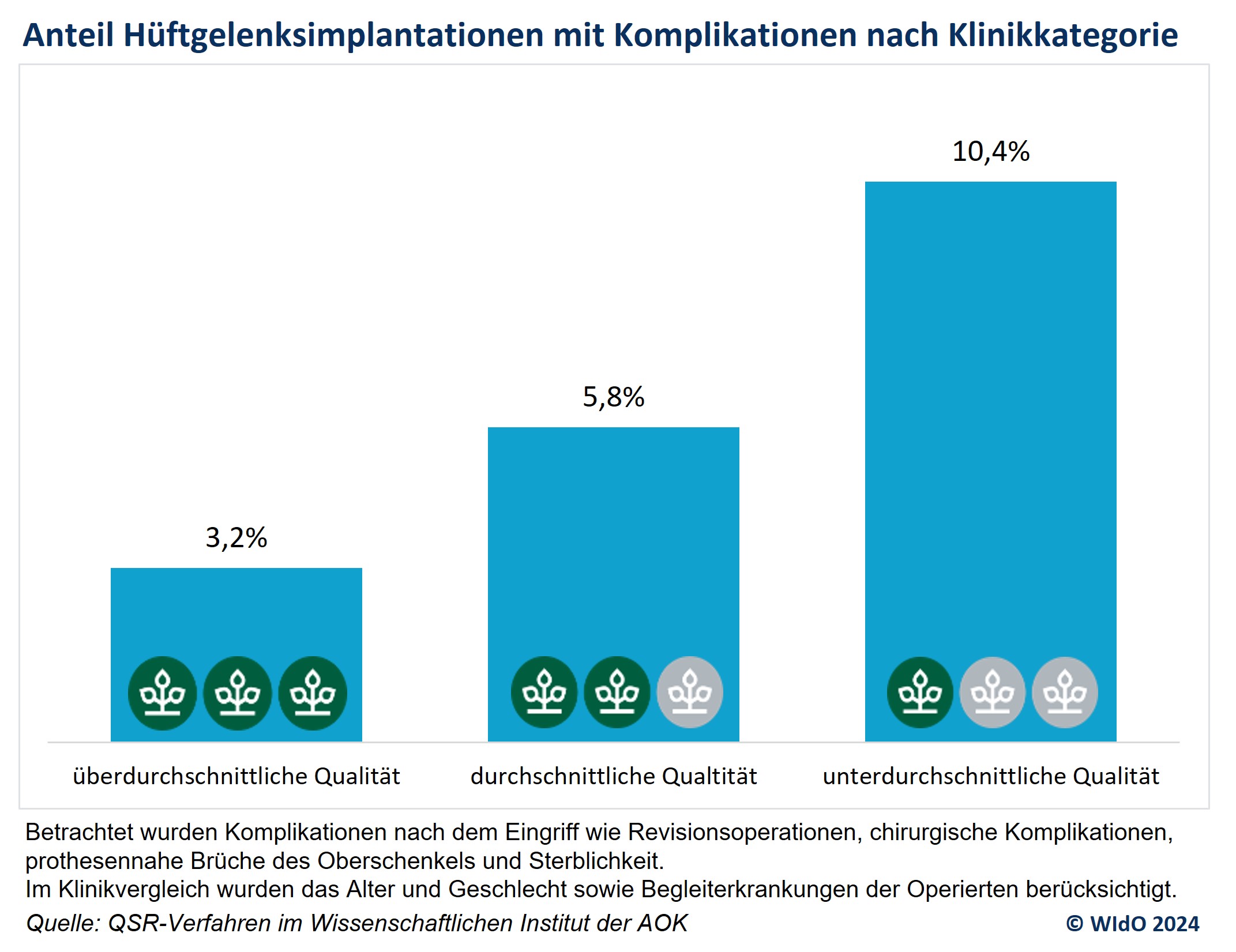 Patientinnen und Patienten, bei denen die Implantation eines künstlichen Hüftgelenkes ansteht, können durch die Wahl eines Krankenhauses mit guten Qualitätsergebnissen das Risiko für Komplikationen deutlich senken. Das zeigt eine aktuelle Analyse von knapp 125.000 Operationen von AOK-Versicherten aus den Jahren 2020 bis 2022 durch das Wissenschaftliche Instituts der AOK (WIdO) auf Basis des Verfahrens zur Qualitätssicherung mit Routinedaten (QSR).