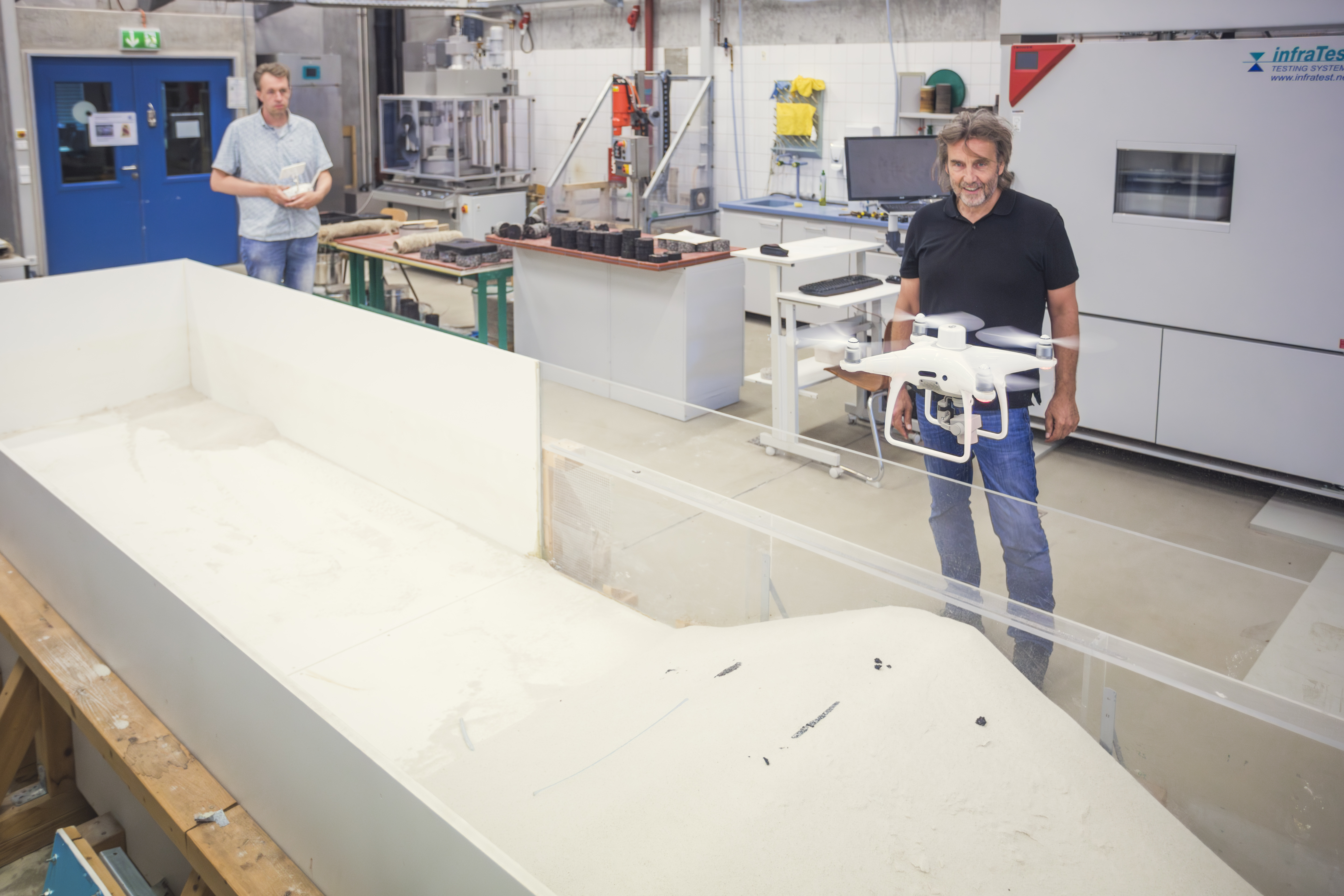 Dafür muss die KI mit entsprechenden Bildern eines Risses oder Schadens angelernt werden. Ausgeschnittene Papierstücke dienen zuerst als symbolischer Riss und sollen mit fortschreitendem Training in Form und Farbe an die Natur angenähert werden. In den Laborhallen der Hochschule haben Ettmer und sein Team einen Versuchsdeich, an dem diese integriert werden können. Die Drohne fliegt über den Versuchsdeich, macht Aufnahmen und die KI-Technologie soll diese als Schaden identifizieren können. Da das Projekt erst Anfang diesen Jahres startete, werden derzeit erst die Grundlagen geschaffen. Dr.-Ing. Daniel Hesse ist Oberingenieur für Wasserbau und bei dem Projekt vorrangig für die Drohnen zuständig. „Aktuell betreiben wir die Drohnen mit einer Standard-RGB-Kamera. Die nächste Aufgabe ist es zu schauen, welche Sensoren wir für die adäquate Umsetzung des Projektes brauchen. Das können Spektralkameras, Laserscannung oder Thermalkameras sein“, führt Hesse aus.