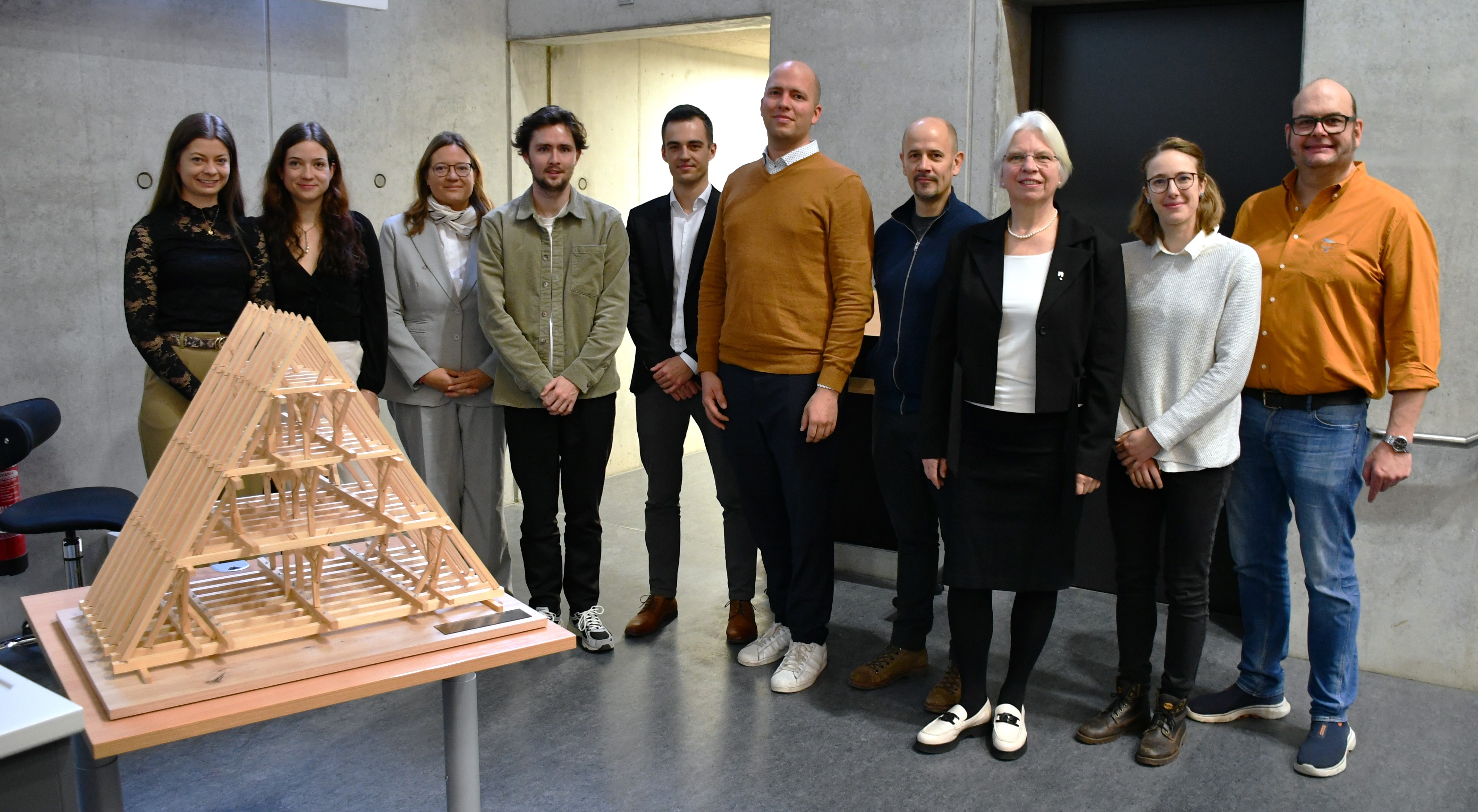 Die beiden Masterandinnen Corinna Kainz und Eva Mader stellten Ihre Masterarbeit vor, in der es um den Langhausdachstuhl des Regensburger Domes ging. Dabei wurde, um den Aufstellvorgang des Dachstuhls nachvollziehen zu können, ein Holzmodell im Maßstab 1:20 gebaut und dabei alle Details des Dachstuhls, inkl. der Blattverbindungen, nachgebaut. Die Masterarbeit wurde sehr gut bewertet und vom Verein der Freunde der OTH Regensburg mit dem Science Award 2024 ausgezeichnet.