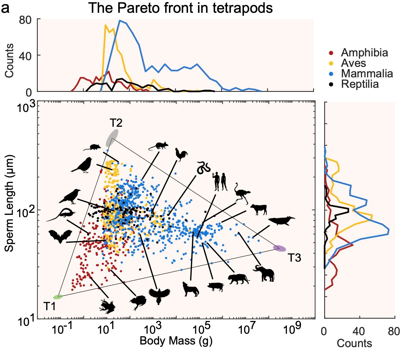 Overall, the findings of the study provide new insights into the evolutionary mechanisms driving variation in sperm length across species and highlight the power of the Pareto framework in detecting complex, non-linear associations between traits. Importantly, this method can be applied to different type of data, including gene expression data, proteins, neural systems and morphological traits.