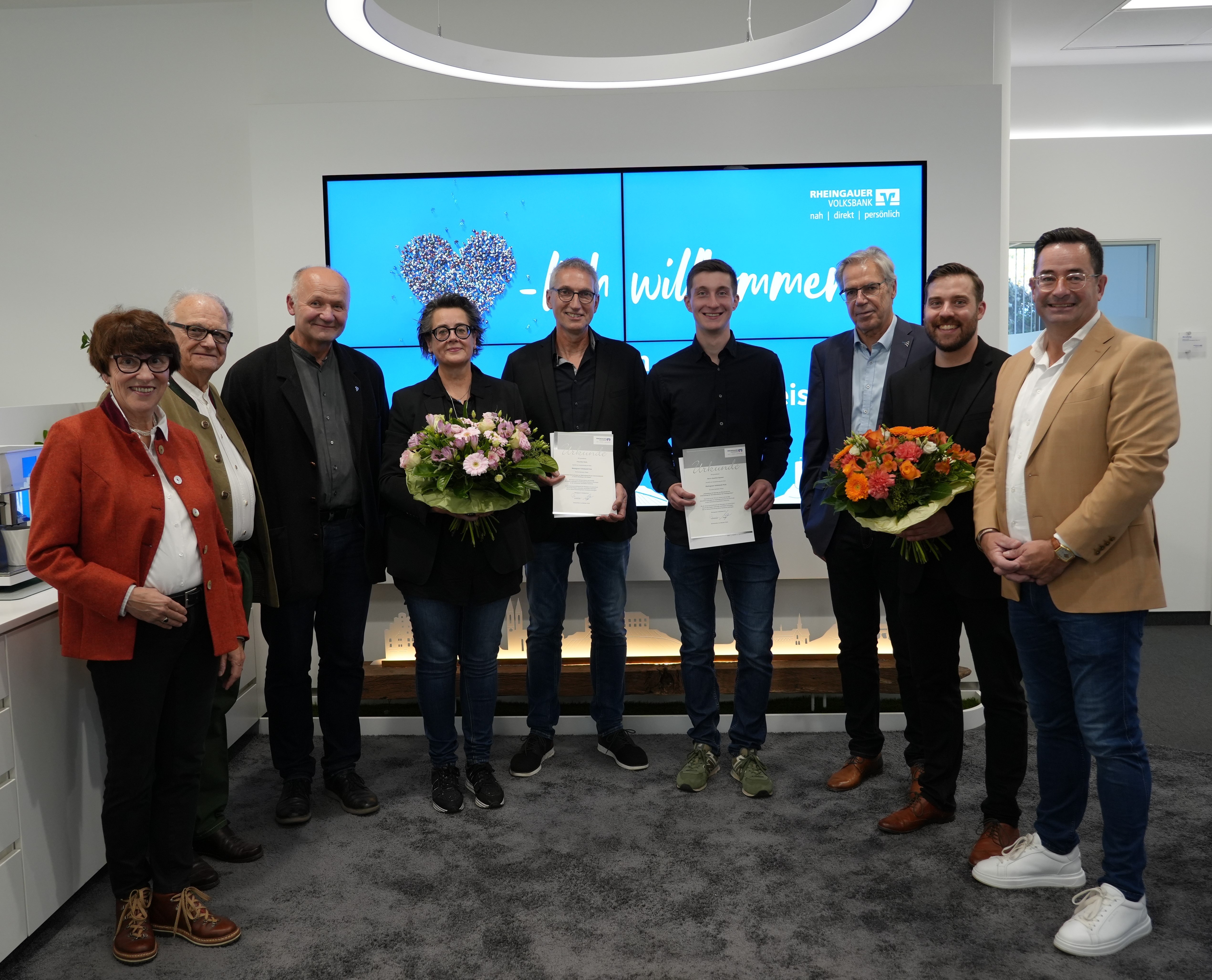 Angela Kühn vom Aufsichtsrat, Prof. Dr. Klaus Schaller, Prof. Dr. Manfred Stoll (HGU), die Eltern der Preisträgerin Kira Dreis, Preisträger Joachim Bumen, HGU-Präsident Prof. Dr. Hans Reiner Schultz, Dr. Timo Strack (HGU) und der Vorstandsvorsitzende der Rheingauer Volksbank Andreas Zeiselmaier
