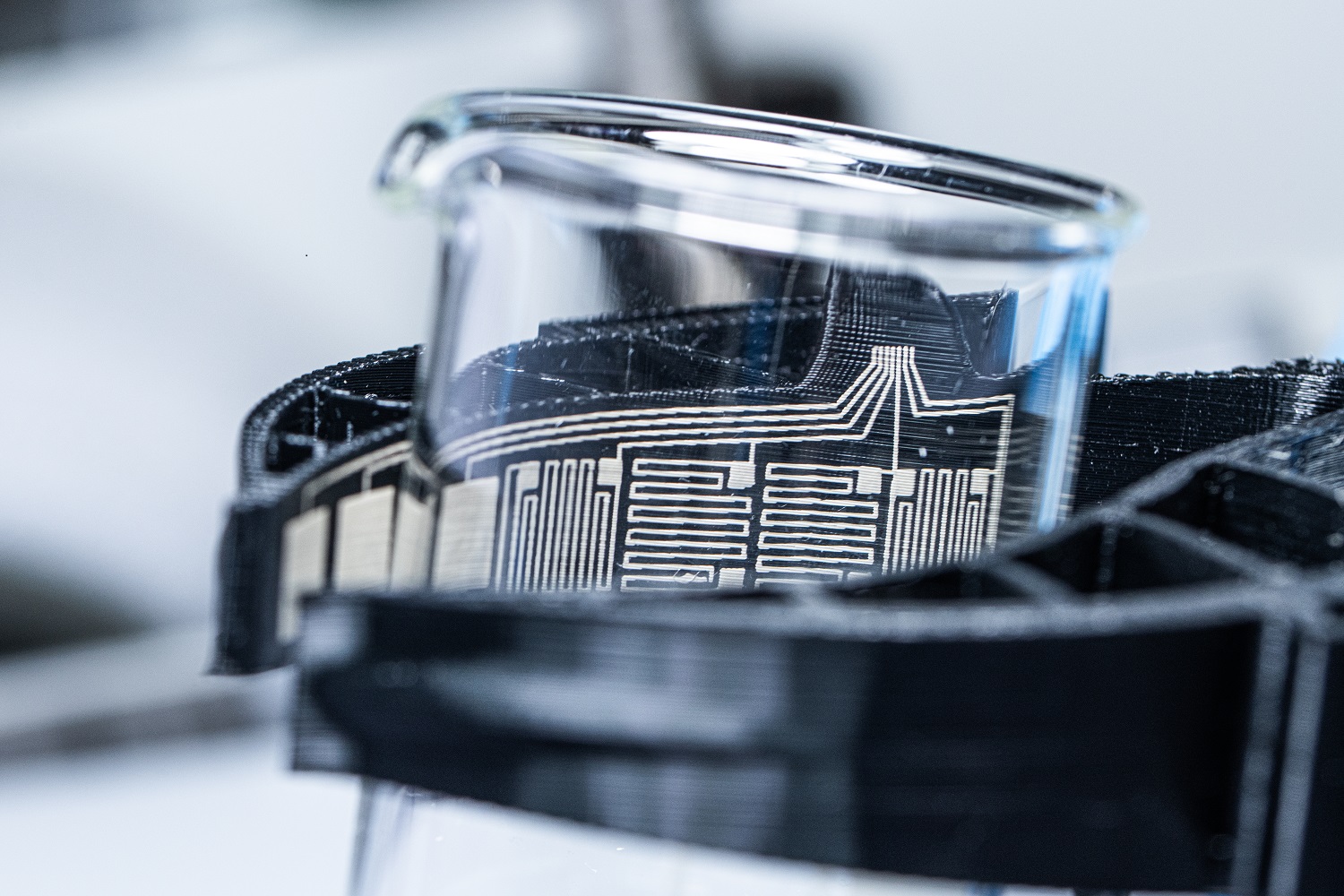 Auf die Oberfläche des Greifers bringt danach ein Dispens-Drucker mit Kanülen feine Strukturen aus Silberpaste auf. Im Anschluss werden die so generierten Muster mittels Infrarotstrahlung funktionalisiert. Zu diesen Funktionsstrukturen gehört beispielsweise ein Mäander-Muster aus 250 Mikrometer schmalen Leiterbahnen. Biegt oder streckt sich der einzelne Finger, ändert sich der elektrische Widerstand des Mäanders. Dadurch lässt sich die Greiferkrümmung jederzeit ermitteln.