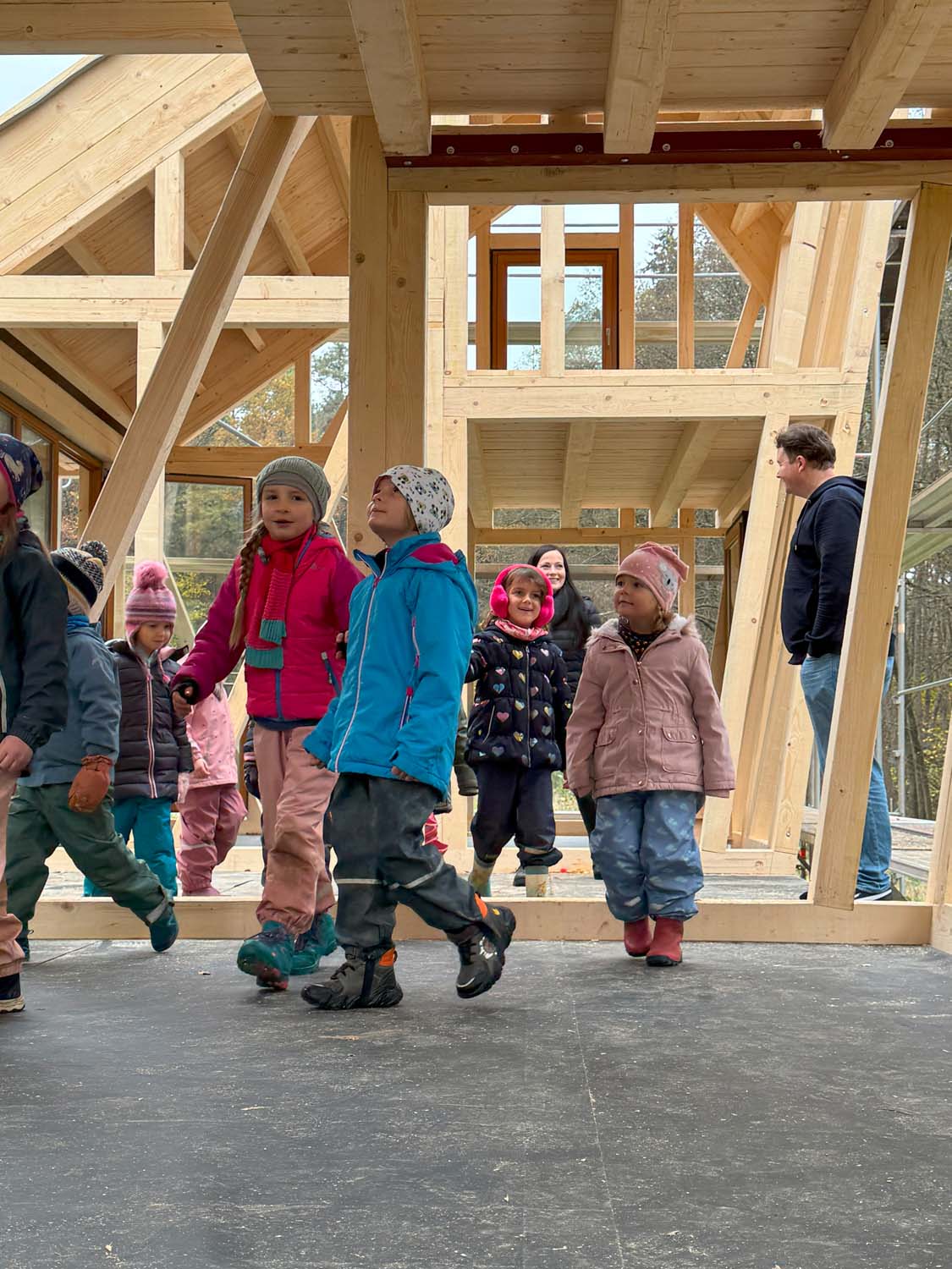 Beim Richtfest würdigte der bayerische Umweltminister Thorsten Glauber in seinem Grußwort des Fördermittelgebers den innovativen Ansatz des Konzepts. Dabei sprach er auch kritisch über überbordende Vorschriften und langwierige Genehmigungsprozesse im Bauwesen. Zimmermeister Fabian Lipfert ergänzte den traditionellen Richtspruch. Jonas, einer der kleinen „Wackelzähne“, fasste nach Besichtigung des künftigen Schutzraumes sein Urteil in einem Wort zusammen: „Super!“
