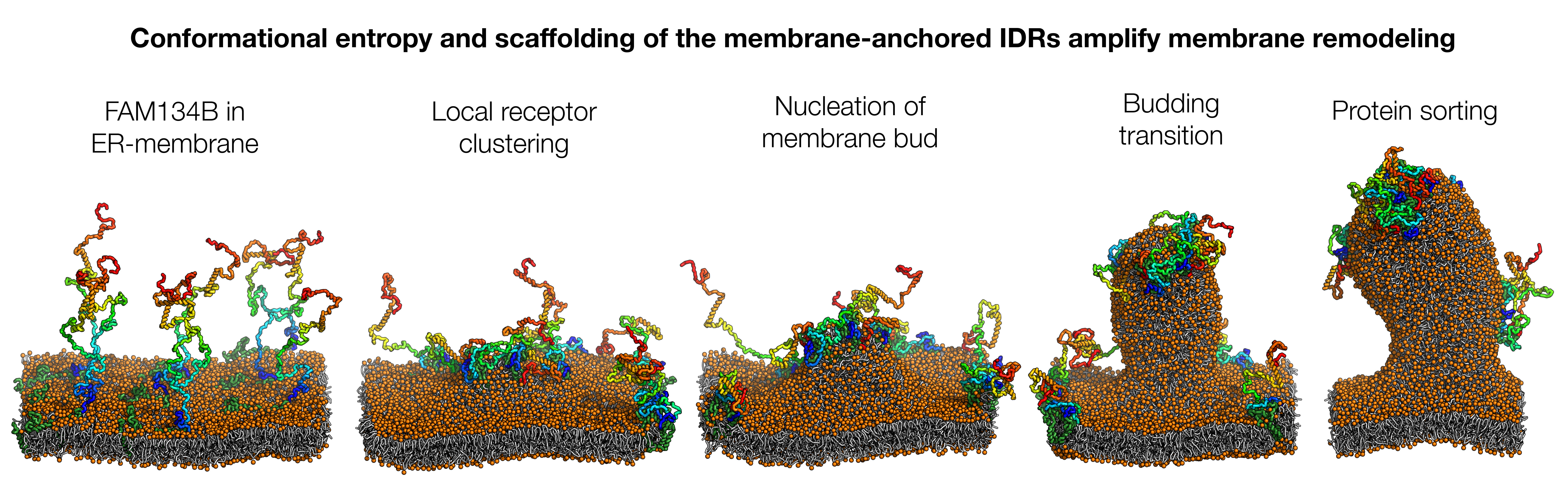 Caption (image and movie): The ER-phagy receptor FAM134B is initially distributed via the membrane surface (left). Its IDRs move back and forth in a largely disordered manner, like tentacles. The formation of local clusters initiates the curvature of the membrane (2nd from left), which is further strengthened by the condensation of the tentacles into more compact structures (2nd from right). The pinching off of the membrane vesicle (not shown) is initiated by a targeted redistribution of proteins (sorting, right). Image: Bhaskara Group, Goethe University Frankfurt