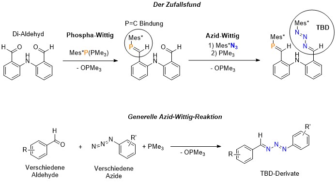 Christian Hering-Junghans, for example, saw the free aldehyde group as an opportunity to insert a nitrogen-carbon double bond (N=C) in addition to the P=C double bond. To this end, Kushik used a derivation of the Wittig reaction, namely the Aza-Wittig reaction.