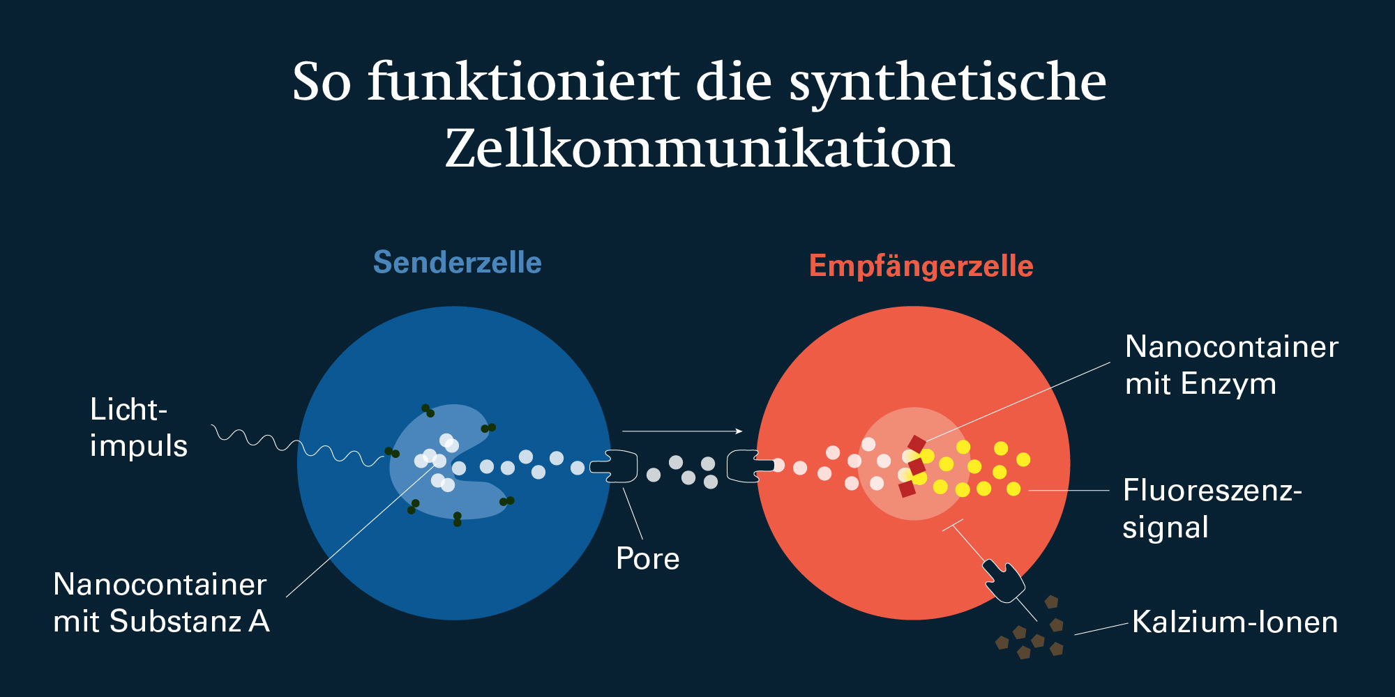 Die Senderzellen enthalten Nanocontainer, quasi künstliche Organellen, in deren Membranen spezielle lichtempfindliche Moleküle, sogenannte molekulare Motoren, sitzen. Dank diesen können die Forschenden die Kommunikation zwischen den beiden Zellen mit einem Lichtimpuls in Gang setzen: Erreicht das Licht die Senderzelle, öffnen die lichtempfindlichen Moleküle die Nanocontainer, die daraufhin ihren Inhalt – nennen wir ihn Substanz A – in das Innere der Senderzelle abgeben.