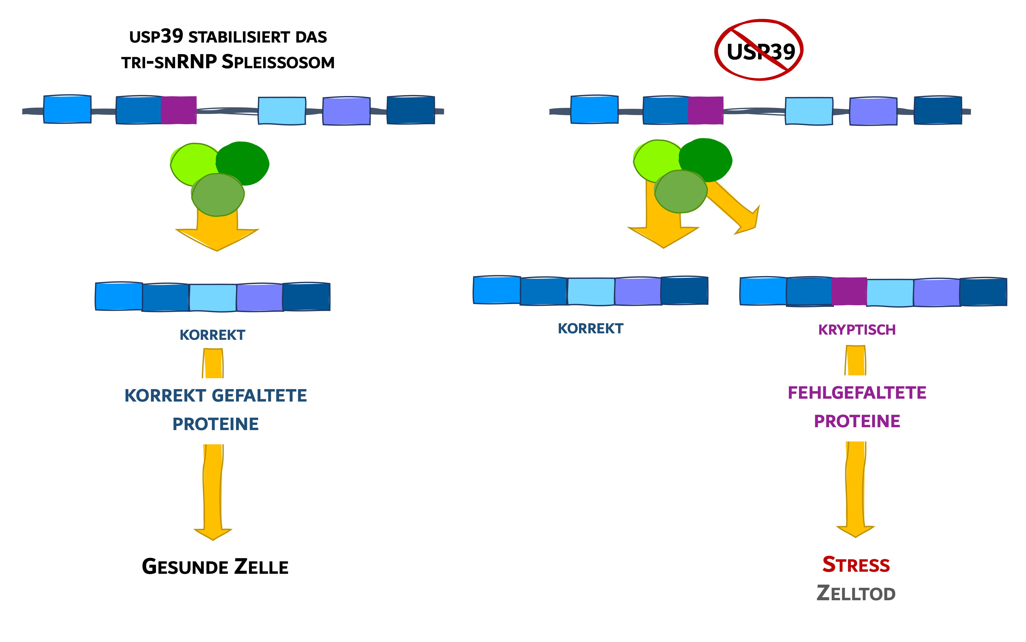 In Experimenten mit Zebrafischen konnten die Forschenden diese Wissenslücke nun schließen. Demnach werden die Bausteine U4, U5 und U6 normalerweise durch ein Protein namens USP39 als dreiteiliger Komplex stabilisiert. Durch Mutationen in den Bausteinen oder das Fehlen von USP 39 wird das verhindert. Das wiederum führt dazu, dass das Spleißosom seine Aufgaben nicht mehr so genau wie zuvor erledigt. Normalerweise sorgt U4/U6.U5 dafür, dass direkt nach dem Auseinanderschneiden der Anleitung die Schnittkante sehr schnell mit dem dazu passenden Gegenstück verbunden wird. Wenn USP39 fehlt (oder die Bausteine mutiert sind), erfolgt diese Neuverknüpfung aber weitaus langsamer.