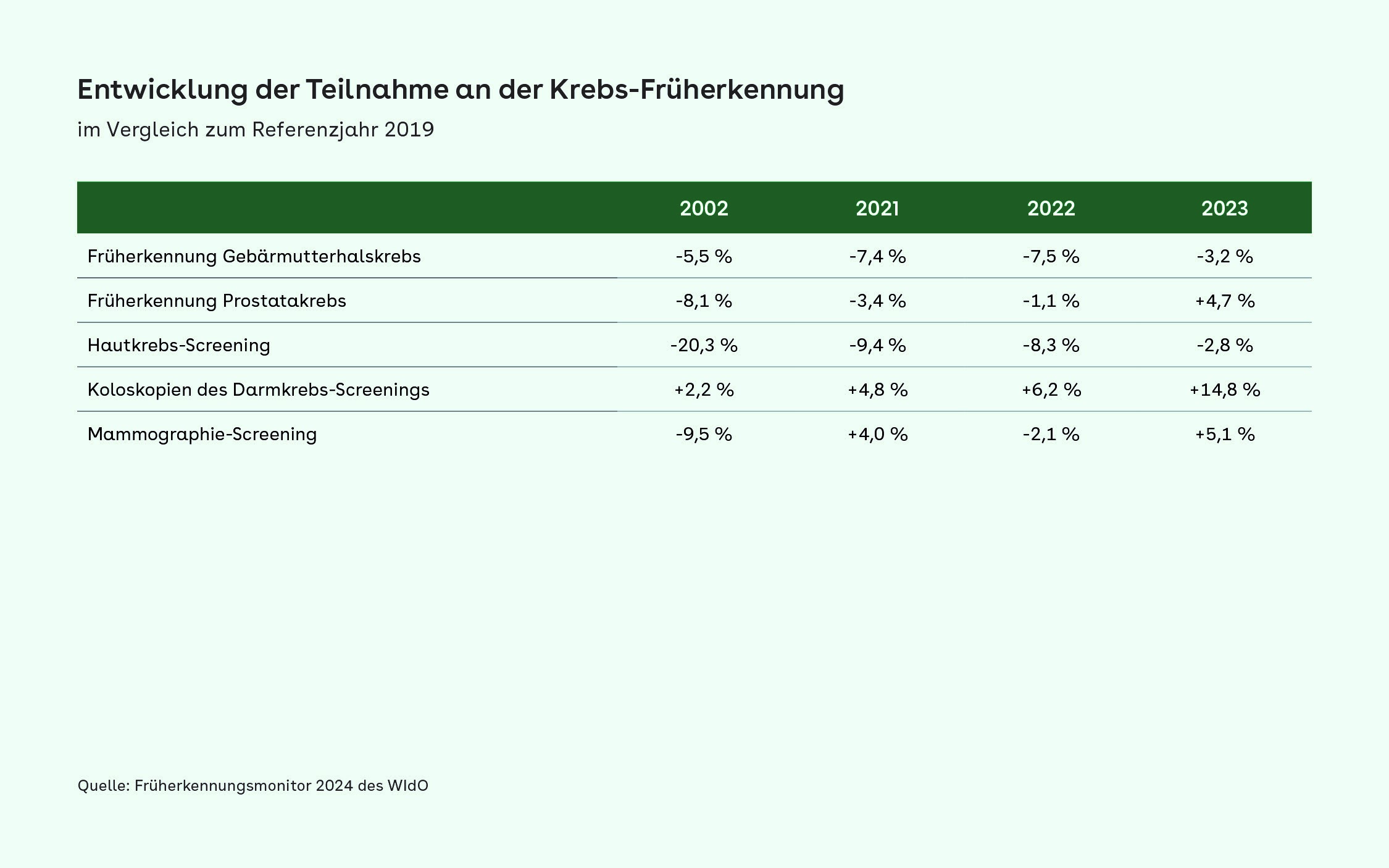 Lediglich bei der Früherkennung von Gebärmutterhalskrebs (minus 3,2 Prozent im Vergleich zu 2019) und beim Hautkrebs-Screening (minus 2,8 Prozent) lagen die Teilnahmeraten noch leicht unter dem Niveau vor der Corona-Pandemie (Abbildung 1). Auch die jüngsten Daten des Früherkennungsmonitors für das erste Quartal 2024 bestätigen das insgesamt positive Bild. „Die Einbrüche der Pandemiejahre gehören endgültig der Vergangenheit an“, sagt Prof. Michael Ghadimi, Präsident der Deutschen Krebsgesellschaft. „Die vielen Appelle der letzten zwei Jahre, versäumte Untersuchungen nachzuholen, scheinen zu fruchten.“ Die frühe Erkennung von Krebs oder von Krebs-Vorstufen könne die Chancen auf Heilung deutlich erhöhen. „Daher trommeln wir weiter gemeinsam für die Teilnahme an den Untersuchungen – zumal es trotz des positiven Trends bei sämtlichen Krebsvorsorge-Untersuchungen noch erhebliches Steigerungspotenzial gibt“, sagt Dr. Carola Reimann, Vorständin des AOK-Bundesverbandes.