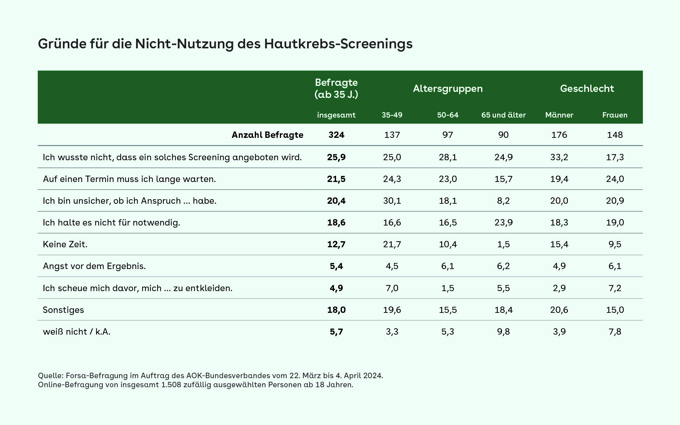 Eine repräsentative Forsa-Befragung im Auftrag des AOK-Bundesverbandes beleuchtet die Gründe für die geringe Teilnahme am Hautkrebs-Screening. Anspruchsberechtige Befragte ab 35 Jahren, die bislang nach eigenen Angaben noch nicht an der Früherkennungsuntersuchung teilgenommen hatten, wurden nach den Gründen dafür gefragt (Abbildung 2). Etwa ein Viertel der Befragten (25,9 Prozent) gab Unkenntnis an, wobei Männer diese Begründung fast doppelt so häufig nannten wie Frauen. Jeder Fünfte verwies auf lange Wartezeiten oder Unsicherheit hinsichtlich der Anspruchs-berechtigung. Bemerkenswert ist vor allem, dass jeder Fünfte (18,6 Prozent) das Screening nicht für notwendig hielt. 12,7 Prozent gaben an, keine Zeit für diese Untersuchung zu haben (Männer 15,4 Prozent; Frauen 9,5 Prozent). „Die Ergebnisse machen deutlich, dass bei diesem Thema weiterhin viel Aufklärungsarbeit notwendig ist“, betont AOK-Vorständin Carola Reimann. „Gerade im Hinblick auf die steigende Belastung durch UV-Strahlung sollte dieses kostenfreie Angebot der gesetzlichen Krankenkassen stärker wahrgenommen werden.“ Gesetzlich Versicherte ab 35 Jahren können das Hautkrebs-Screening gegen Vorlage ihrer Gesundheitskarte alle zwei Jahre beim Haus- oder Hautarzt durchführen lassen. „Der beste Schutz vor Hautkrebs ist konsequenter UV-Schutz – eine einfache, aber effektive Maßnahme, um das persönliche Hautkrebsrisiko zu senken. Die zweite wichtige Säule der Hautkrebs-Prävention ist die regelmäßige Teilnahme an den Check-ups. Denn in den meisten Fällen ist Hautkrebs heilbar, wenn er früh genug erkannt wird“, ergänzt Prof. Michael Ghadimi von der Deutschen Krebsgesellschaft. Die Forsa-Befragung fand vom 22. März bis 4. April 2024 statt; insgesamt 1.508 zufällig ausgewählte Personen ab 18 Jahren wurden online befragt.
