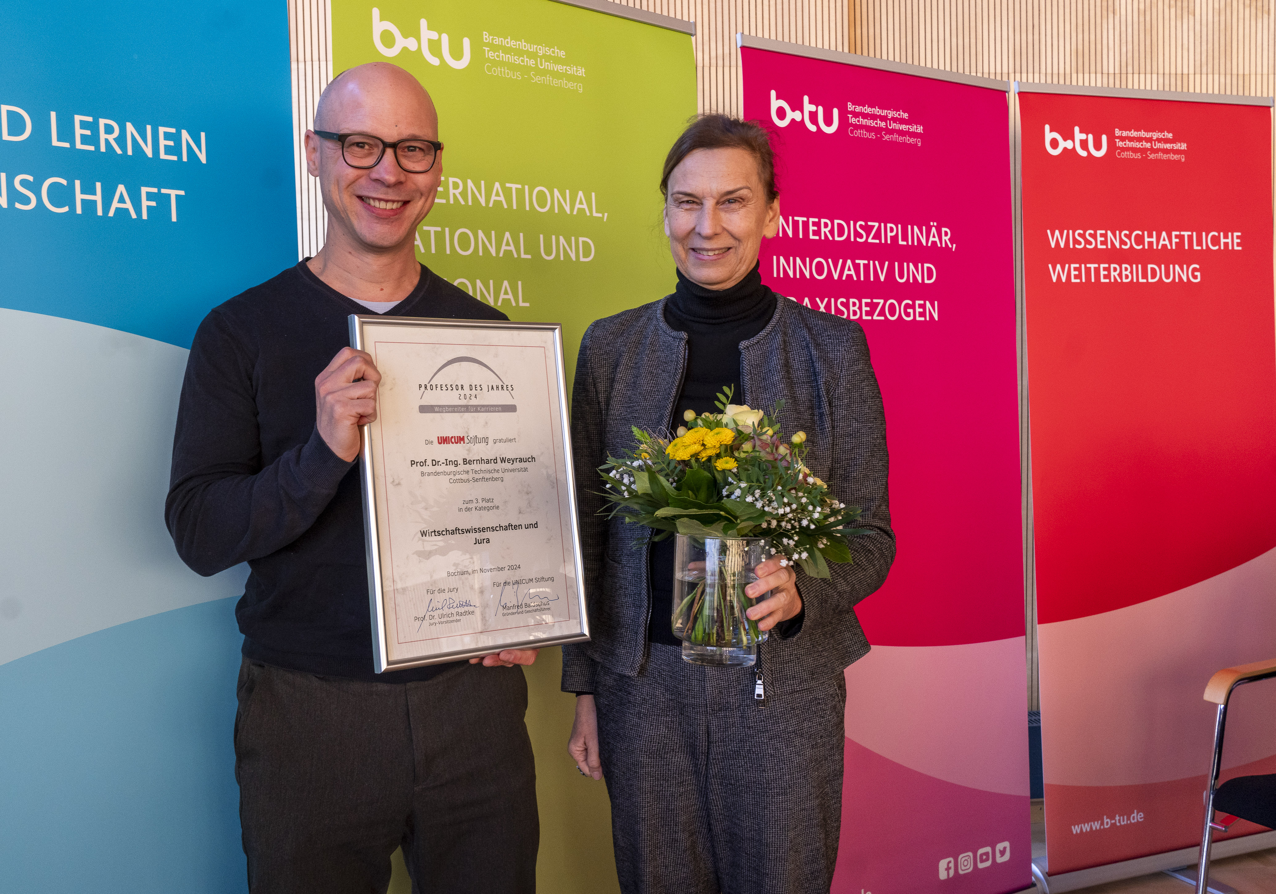 BTU-Professor Bernhard Weyrauch, Dekan der Fakultät Architektur, Bauingenieurwesen und Stadtplanung, wurde von der UNICUM Stiftung mit dem dritten Platz in der Kategorie „Wirtschaftswissenschaften und Jura“ im bundesweiten Wettbewerb „Professor des Jahres 2024“ ausgezeichnet.